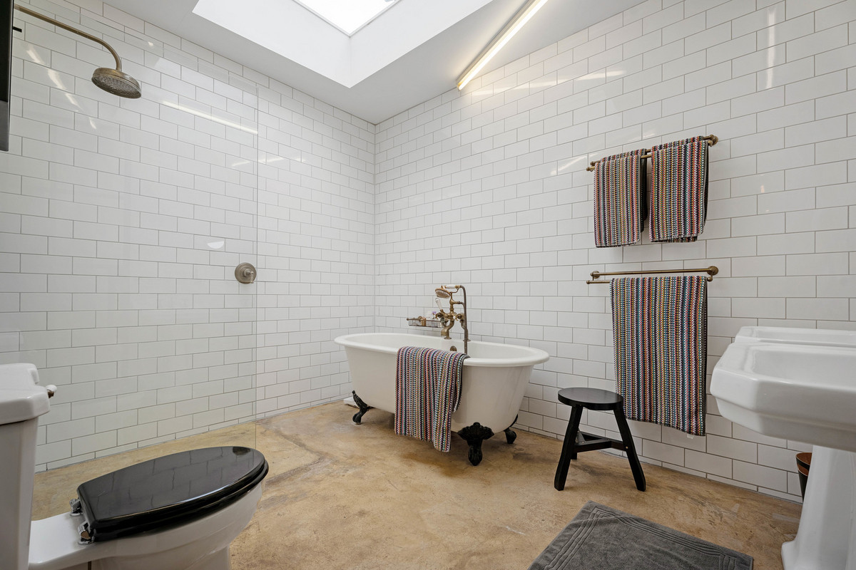 Step through the discreet front door and down a dramatic 60-foot hallway—bathed in natural light from a glazed roof—before arriving in the vast, open-plan heart of the home. Soaring double and triple-height ceilings, exposed steel beams, Leamington brick, and hand-finished concrete floors set the tone. Expansive living areas are illuminated by six skylights and softened by underfloor heating, while striking Crittall-style doors lead to two private ‘winter gardens’ for tranquil indoor-outdoor flow year-round.