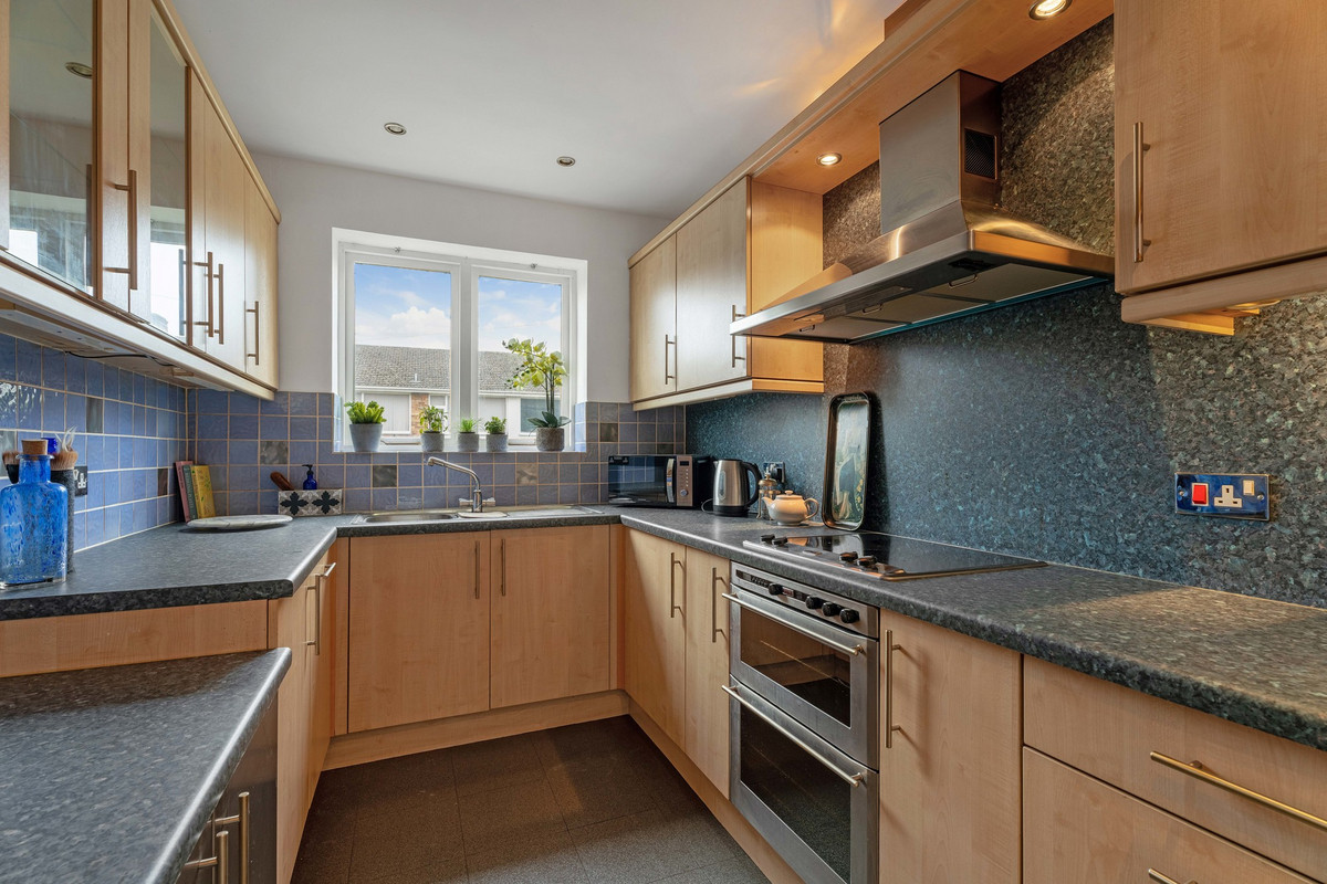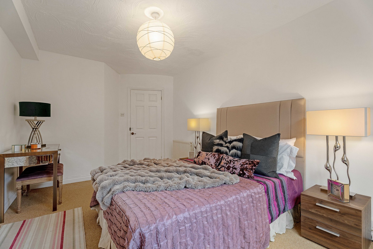 An entrance hall leads directly to two ground-floor bedrooms and a family bathroom complete with marble tiling and shower over bath. Access to the private rear courtyard garden is through one of the bedrooms and benefits from external lighting, a water feature, and brick-walled raised beds. There is also side door access off the hallway into the integral single garage.