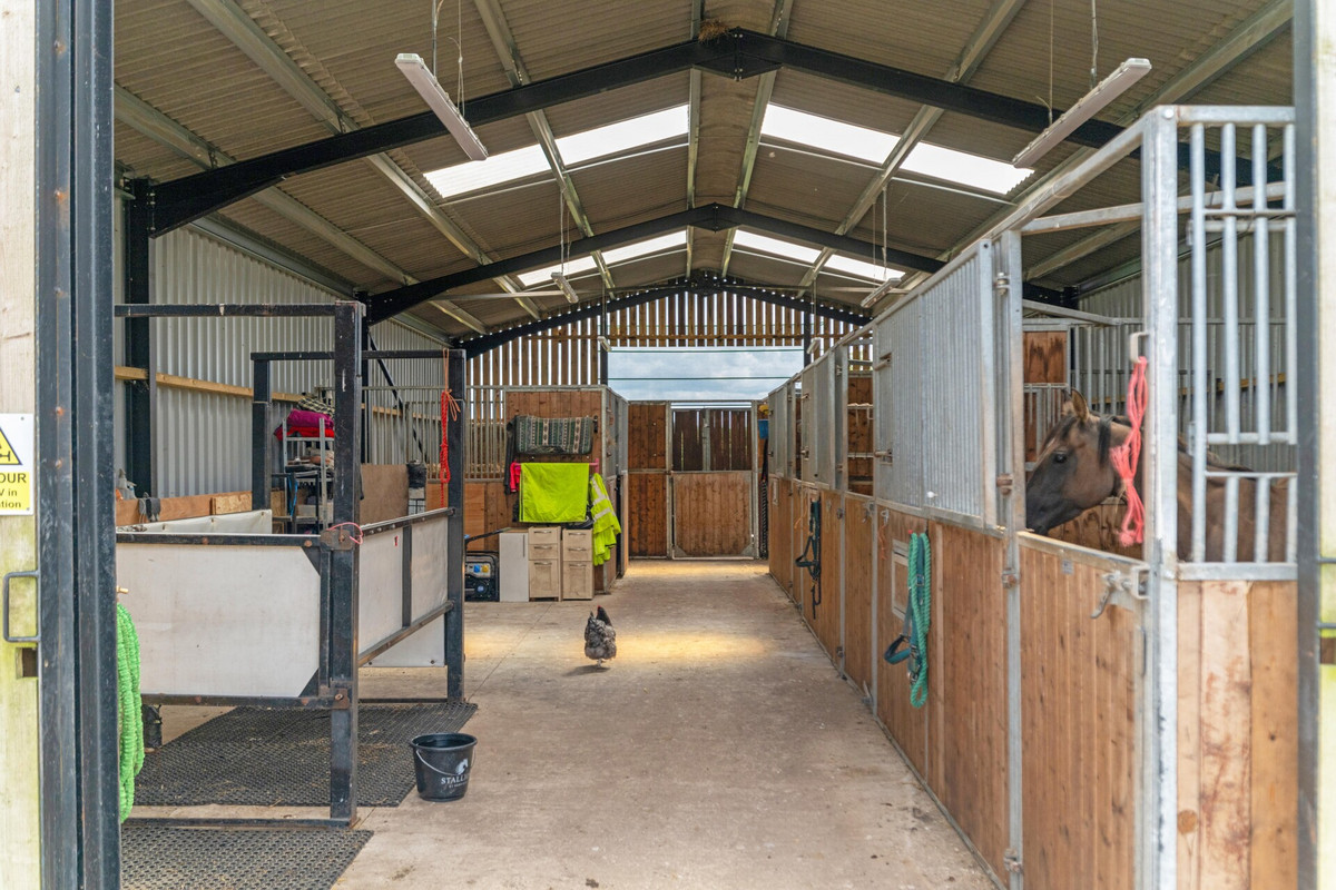 The grounds extend to approximately 6 acres, offering superb equestrian or leisure potential. There is a spacious outbuilding, currently offering six stables including foaling box and a large storage area. There are also several field shelters which would remain. There is a large gravel area for parking for both the equestrian facilities and Grain Barn.