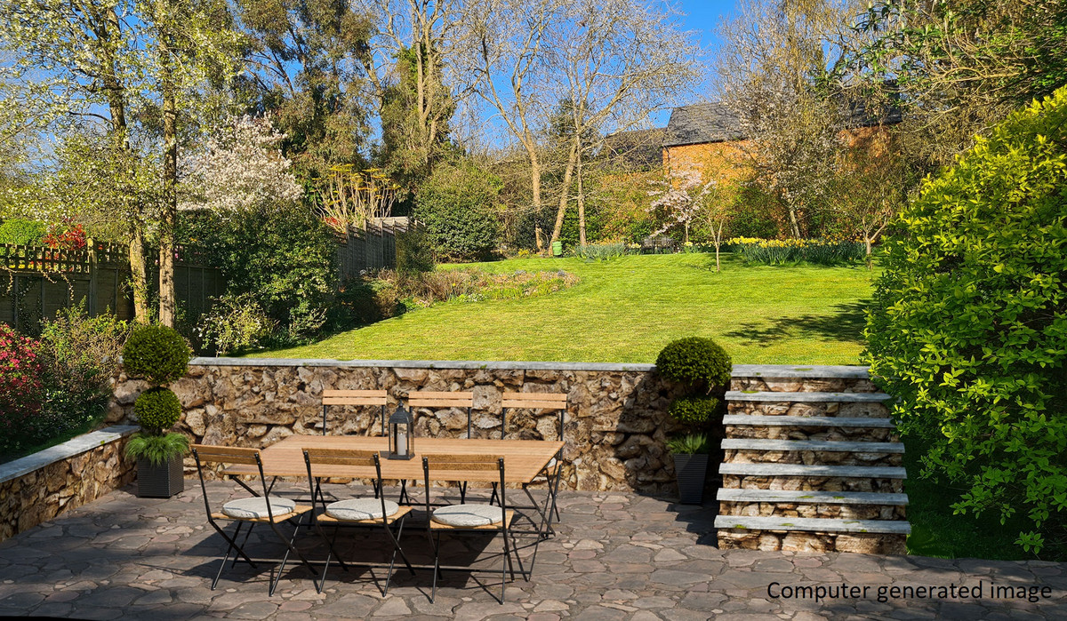 - Landscaped gardens with mature trees and seating area with potential for alterations (see CGI image)