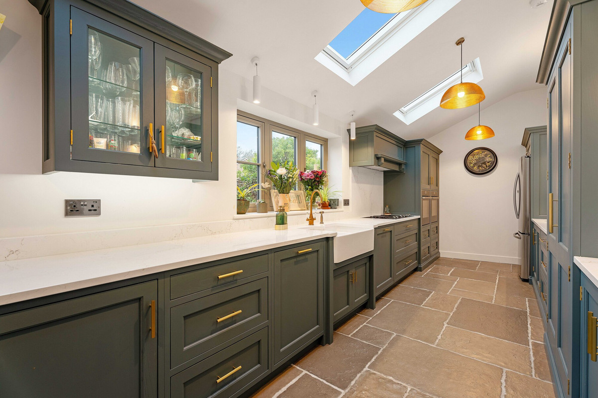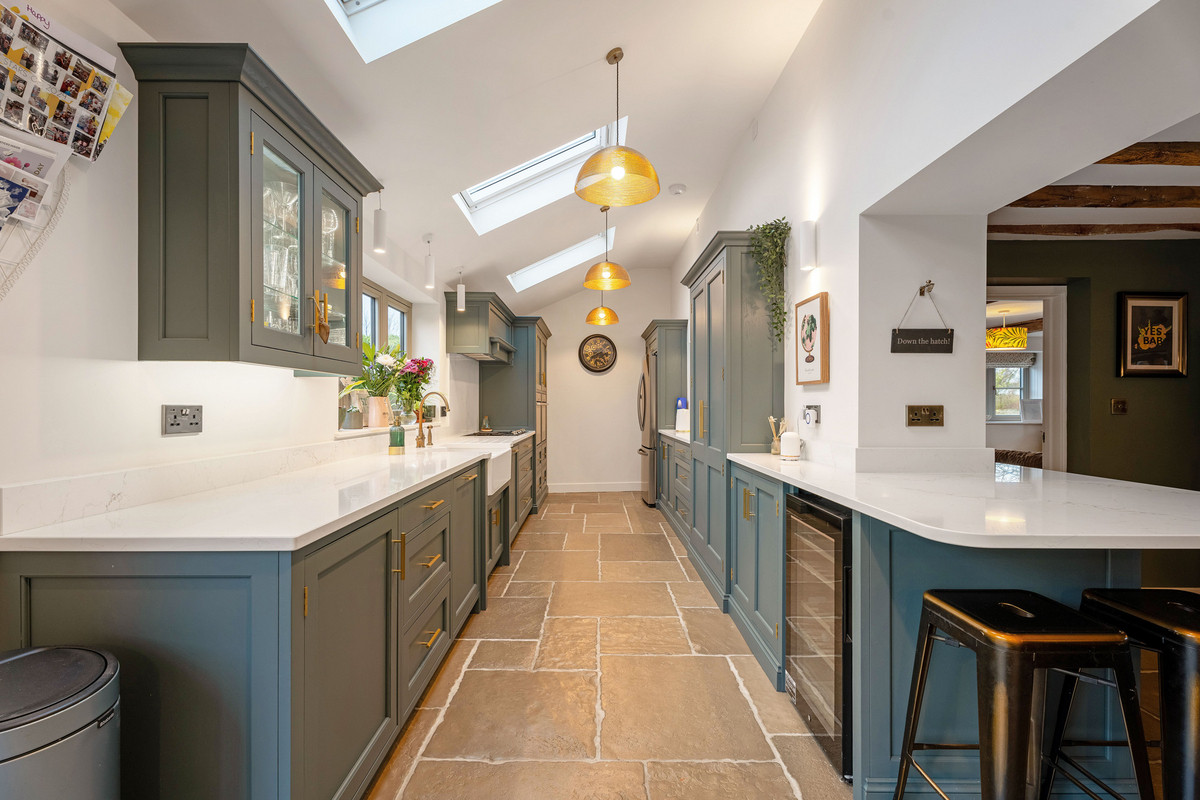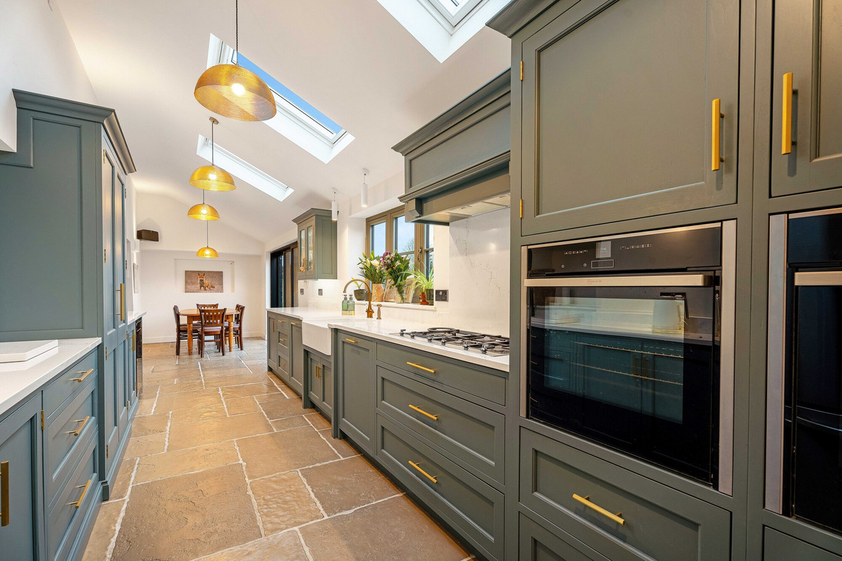 Upon entering through the oak-framed porch, you are welcomed by a spacious hallway featuring flagstone flooring and exposed timbers, leading to a variety of well-appointed living spaces. Underfloor heating creates a luxury feel and the bright and cosy living room features a charming inglenook fireplace and exposed stone walls creating a warm and inviting atmosphere. The adjacent family room offers a more intimate space for relaxation, complete with rustic beams and feature fireplace with log burner. At the heart of the home is the open-plan kitchen and dining room, beautifully fitted with handcrafted cabinetry, quartz countertops, and two Neff slide ‘n’ hide ovens, with skylights flooding the space with natural light and a seamless flow to the main living areas, perfect for entertaining. Additionally, the ground floor includes a convenient utility room and guest WC, providing practical storage and essential facilities.