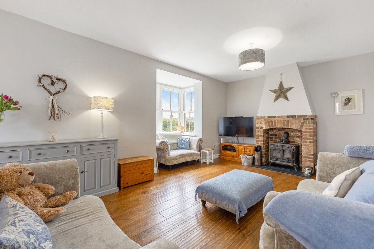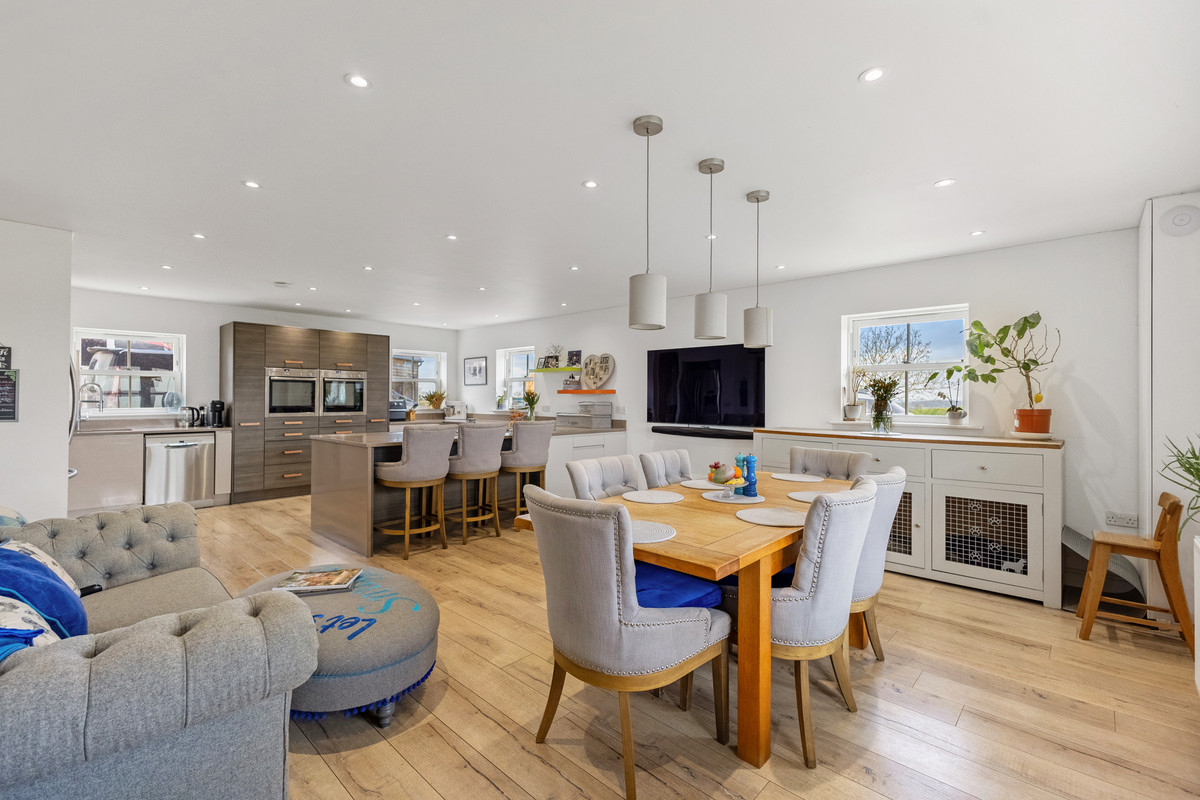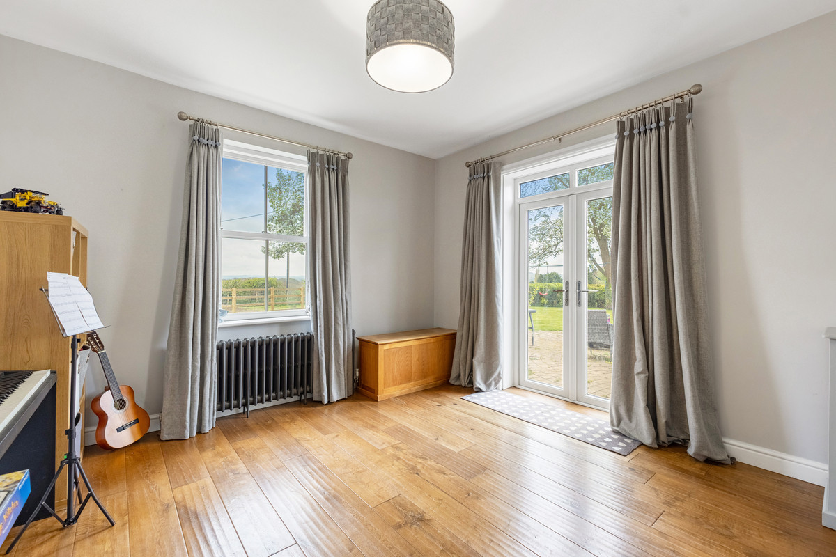 A welcoming entrance leads into a beautifully modernised family home combining characterful features with contemporary living. At its heart is an expansive open-plan kitchen/dining/family area, complete with breakfast bar and seating and ample cabinetry. The main living room is centered around a charming fireplace and framed by large windows and French doors that bathe the space in natural light with one end currently being used as a music area. A well-appointed utility room and a practical boot room add to the daily convenience of countryside living, while a versatile ground-floor room — ideal as a study, office, or occasional guest bedroom — enhances the home's flexibility.