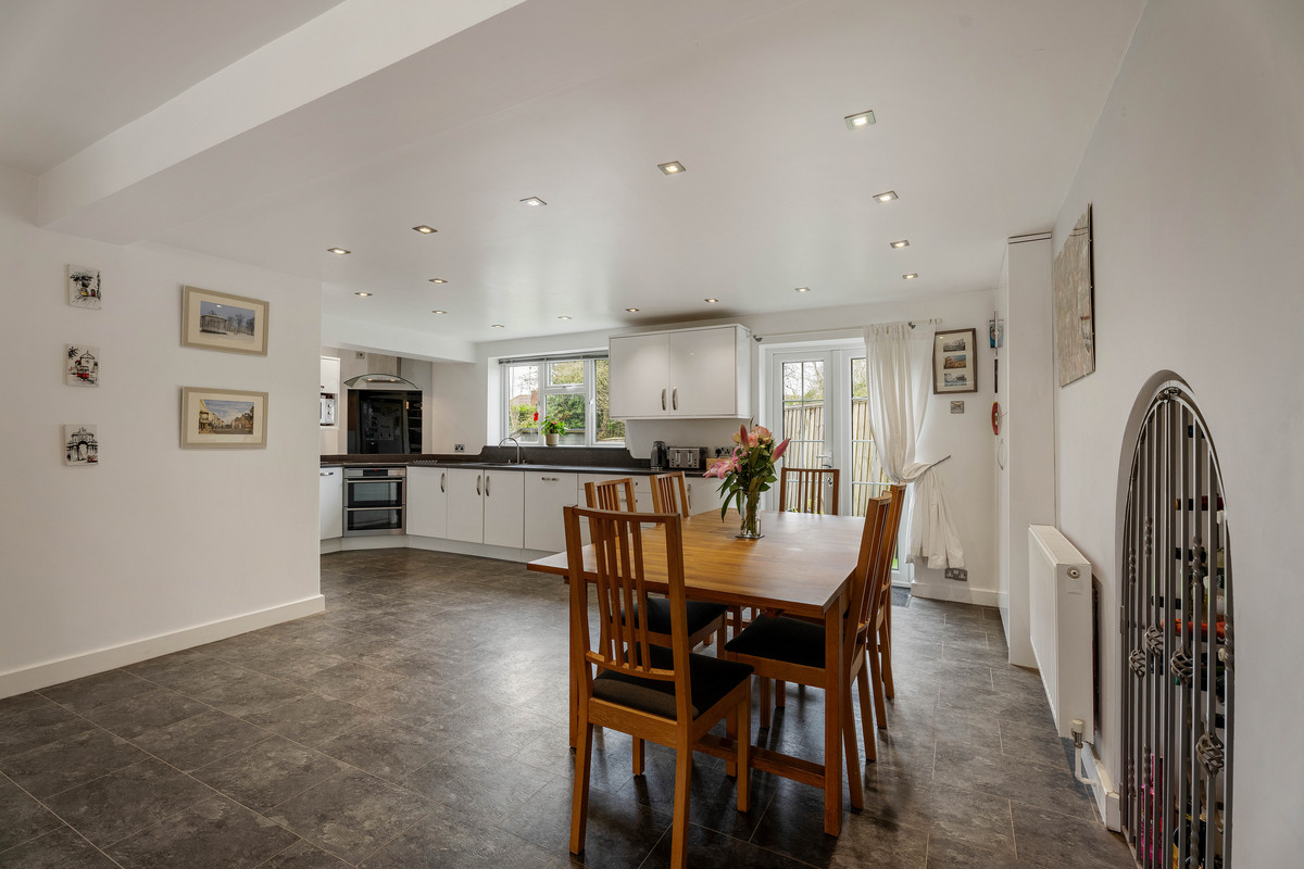 Upon entry through a wooden and tiled porch there is an engineered oak timber floor hallway that leads to both the formal living room and open plan kitchen/dining/family room with under floor heating and LVT flooring. The living room has a bay window, open fire with wood burner and built in entertainment cupboards.