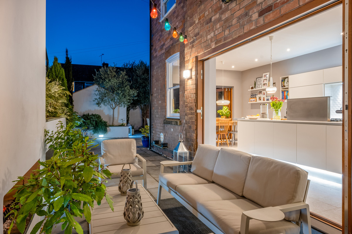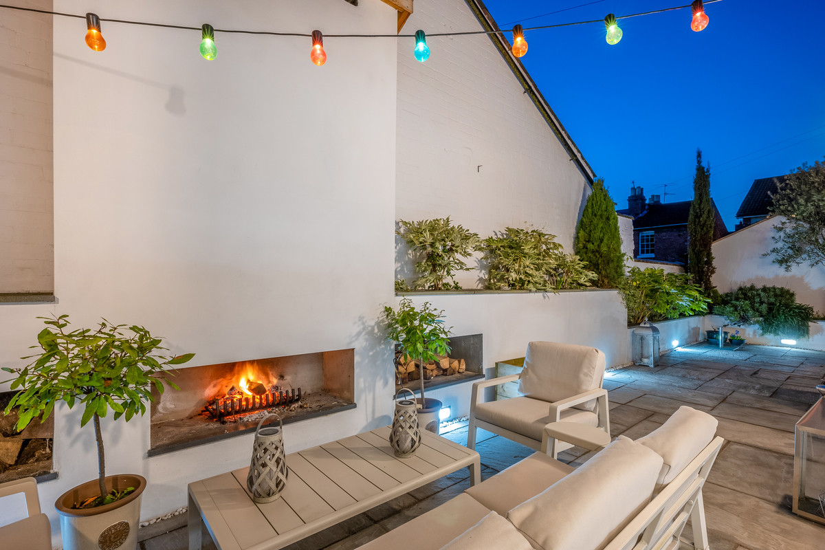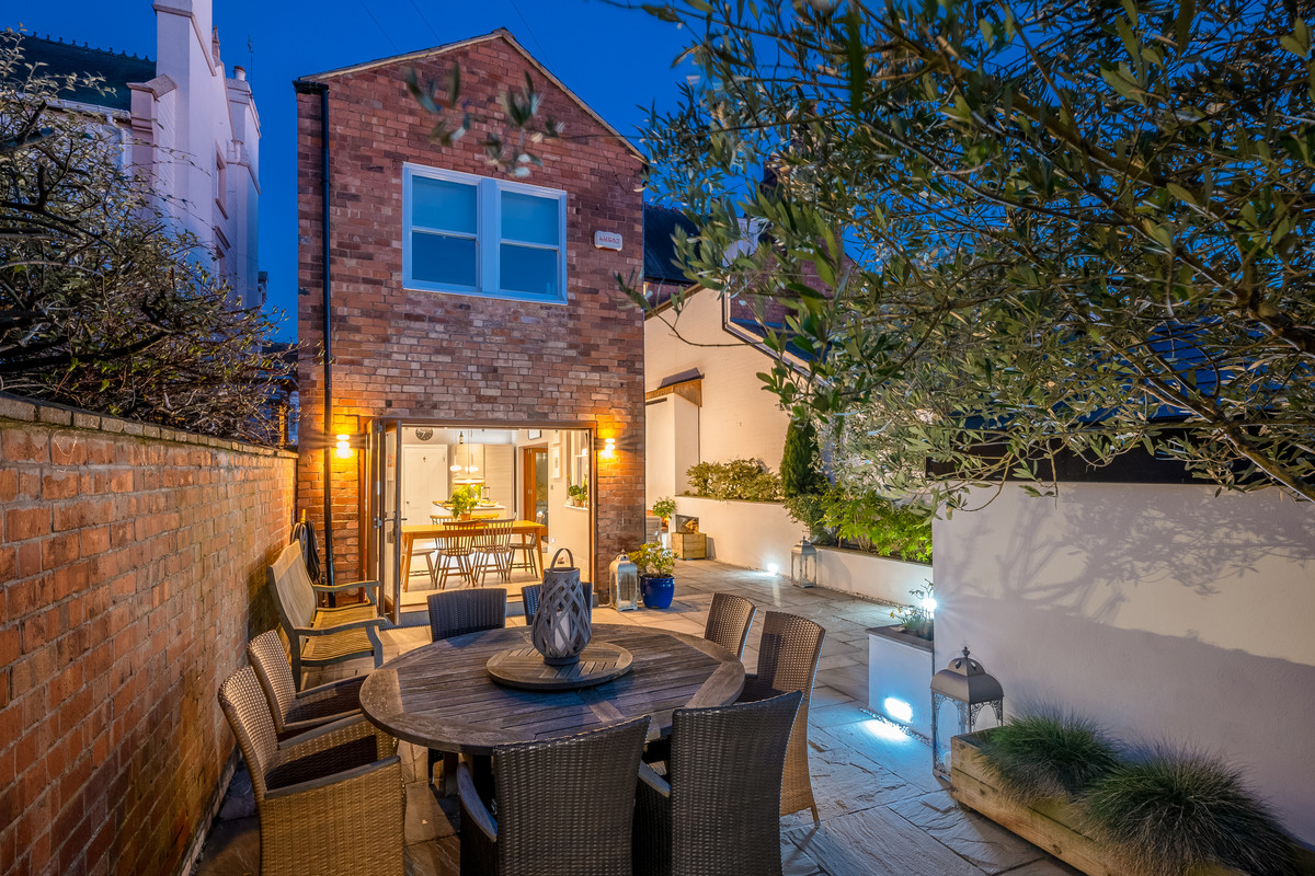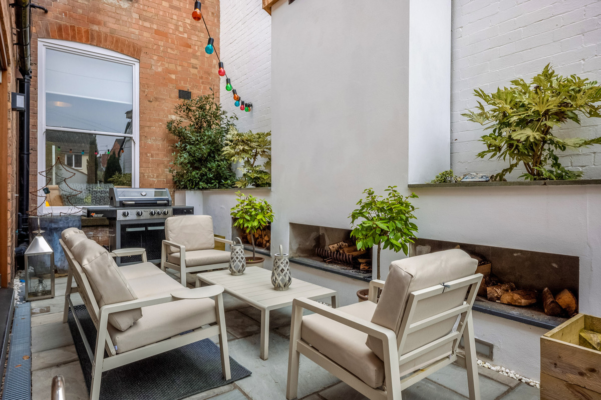 Two sets of bifold doors from the kitchen dining area open out onto a wonderful paved walled Mediterranean style garden with raised flower beds and a spectacular brick-built wood burning fireplace with log storage on either side. There is also a single garage with rear access and a small brick-built outhouse, the front garden is also beautifully presented.