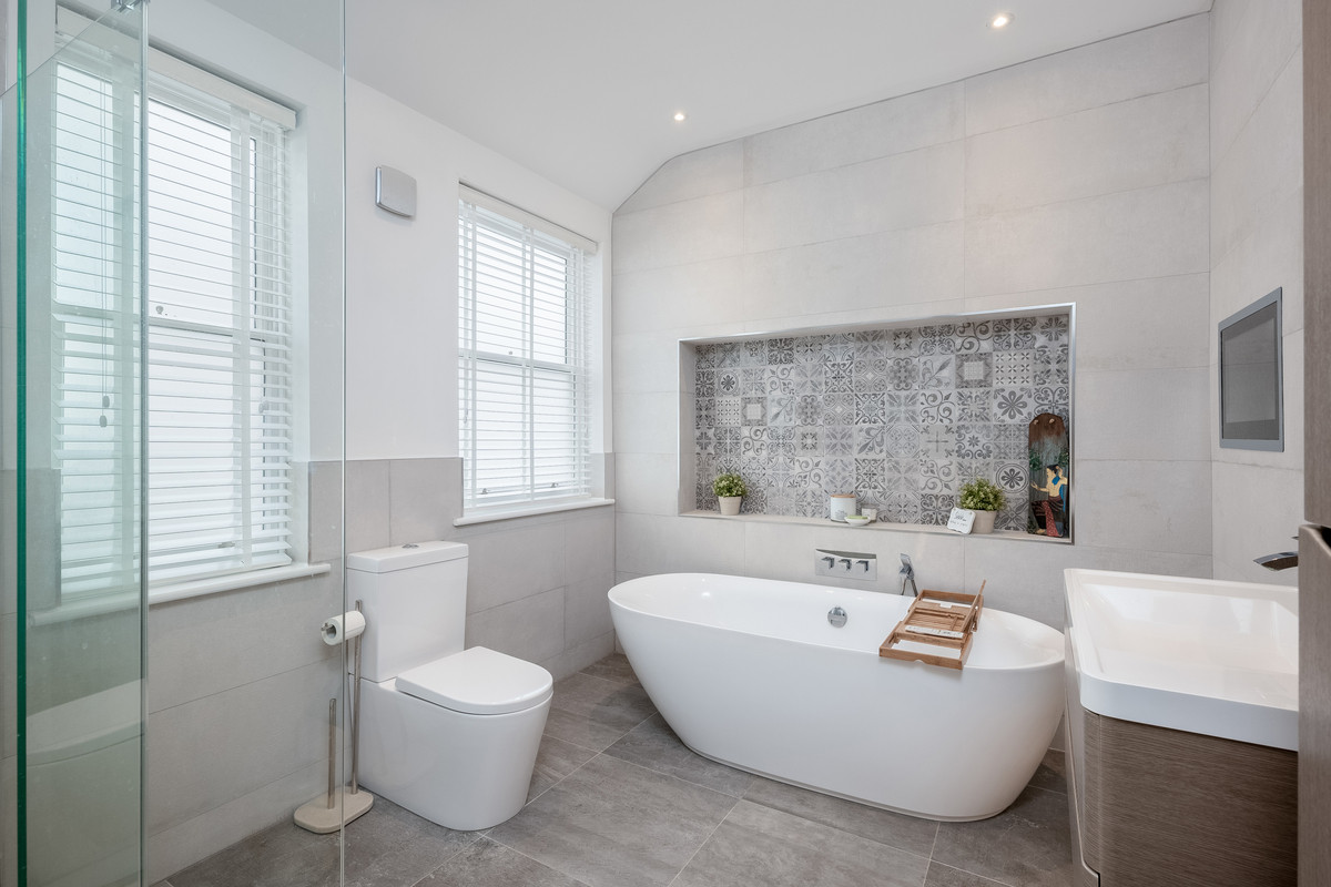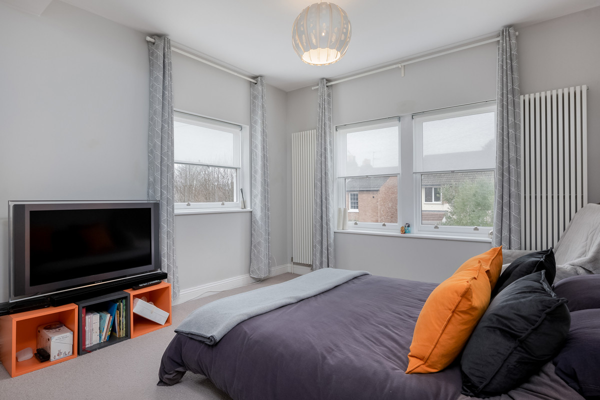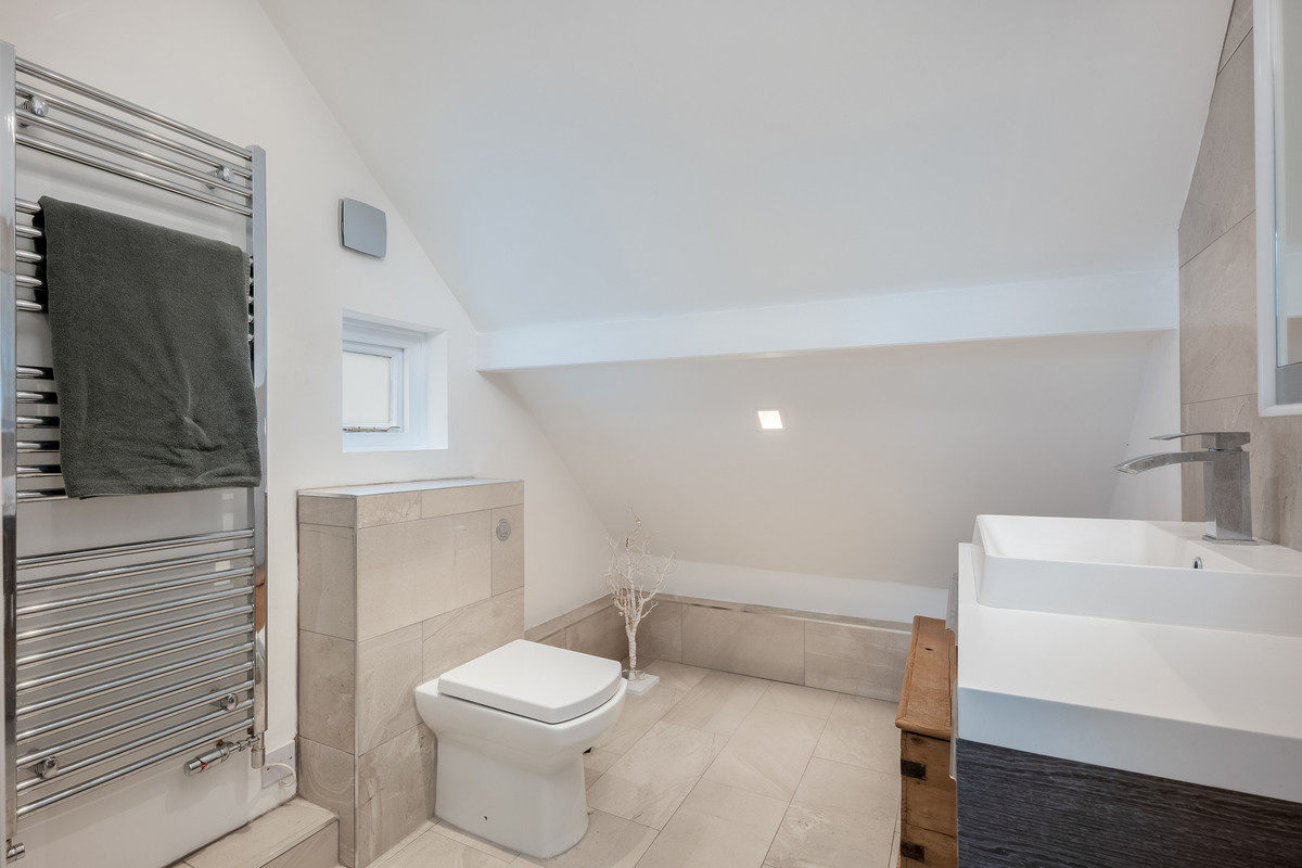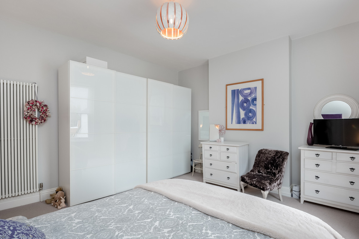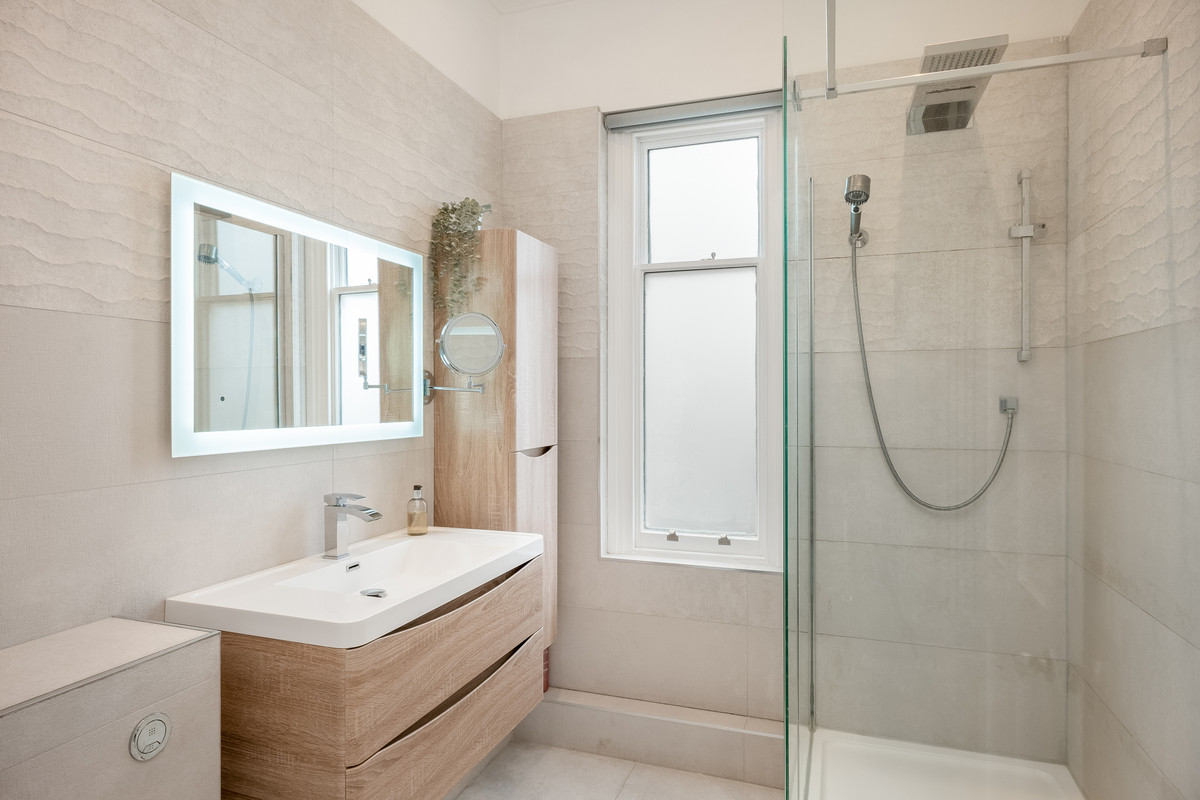 Stairs leading from the main hallway give access to three bedrooms and a family bathroom on the first floor. The generous main bedroom benefits from a large bay window, fireplace and well equipped ensuite shower room. The second double bedroom has a large sash window to the rear of the property and the third bedroom benefits from dual aspect windows. The large family bathroom on the first floor features a freestanding bath with decorative tiled alcove, a built-in television and LED mirror with blue tooth speaker, w/c, hand basin and a large walk-in shower.