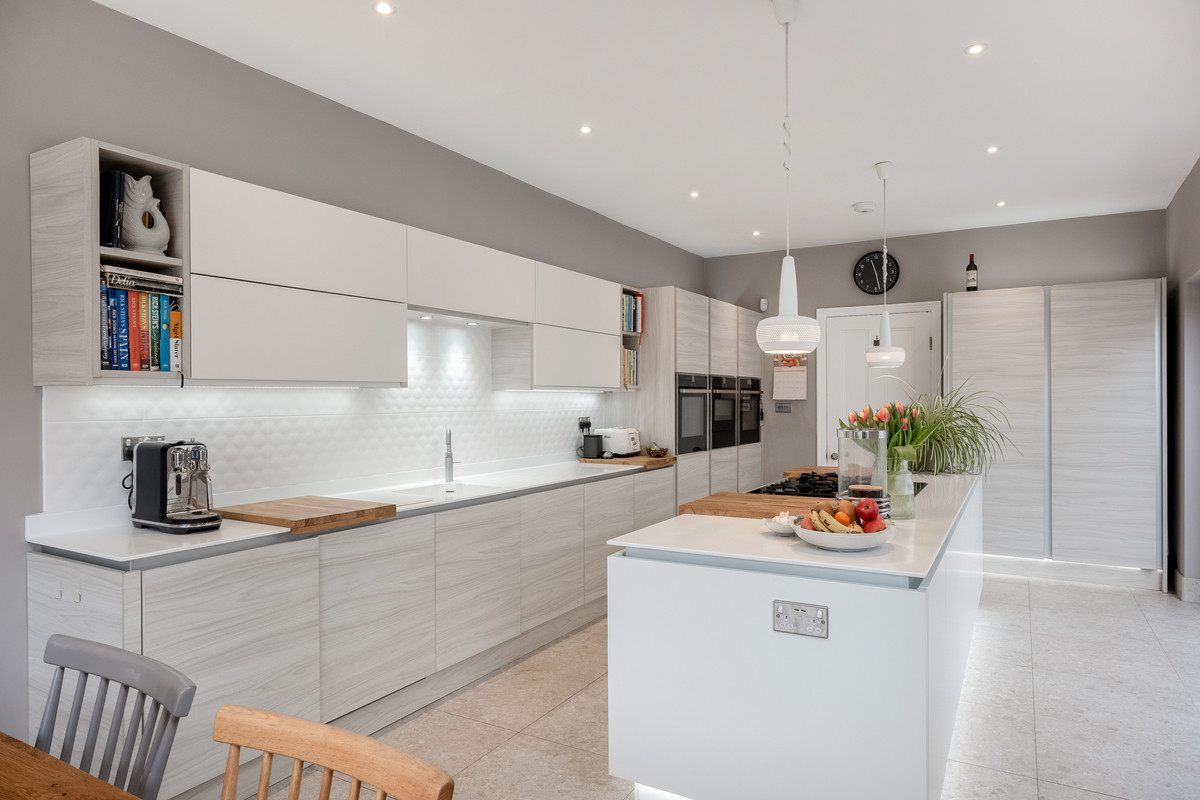 The light and contemporary kitchen features a wealth of both wall and floor mounted units, built in appliances such as three ovens with microwave and steaming options, a warming draw, large, concealed fridge, a Quooker tap and a separate freezer. On the large island is a five-ring gas hob and retractable extractor. Two sets of bifold doors and a picture window flood the area with light and connect both the kitchen and dining area with outside space making this a wonderful place to entertain.