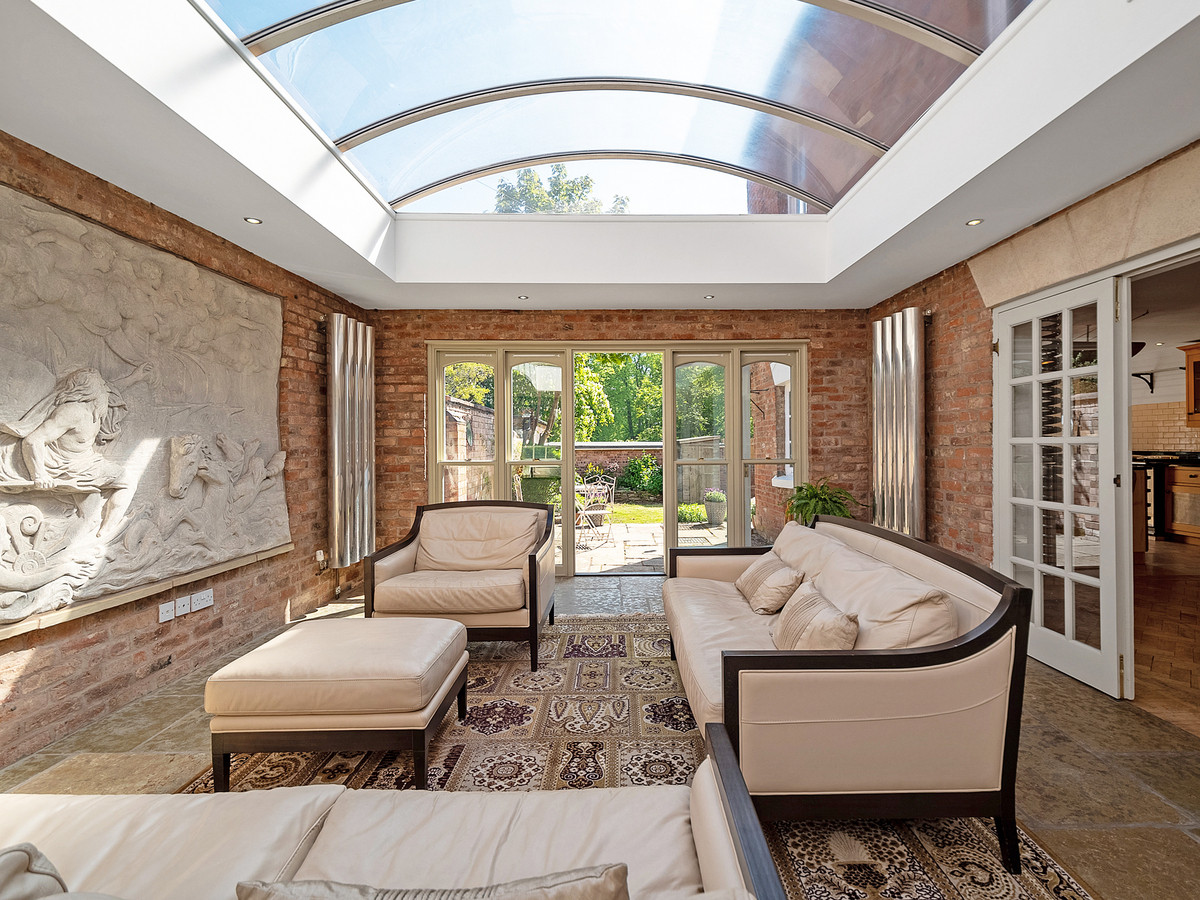 The stunning Orangery features an arched aluminium framed roof, reclaimed French stone flooring, hand-carved Vicenza stone mural and has French doors leading out into the garden.
