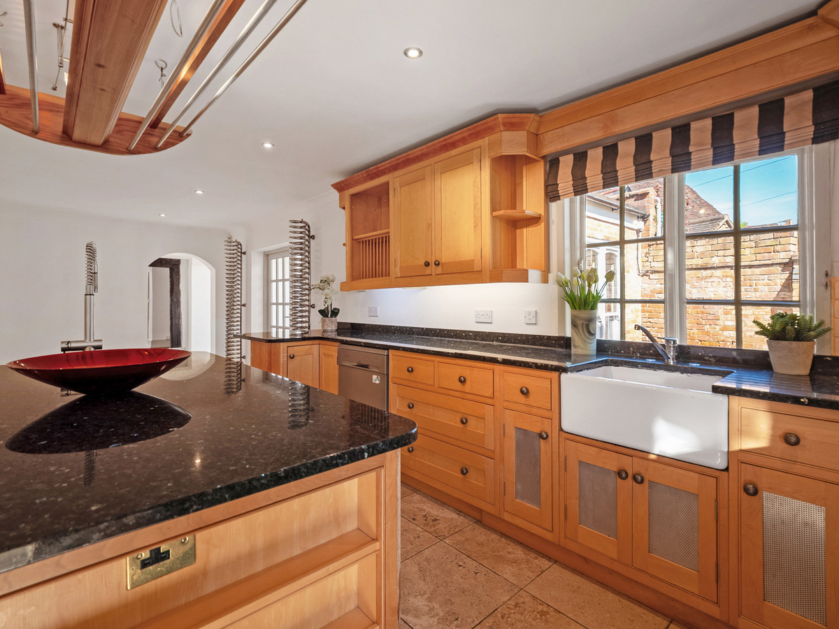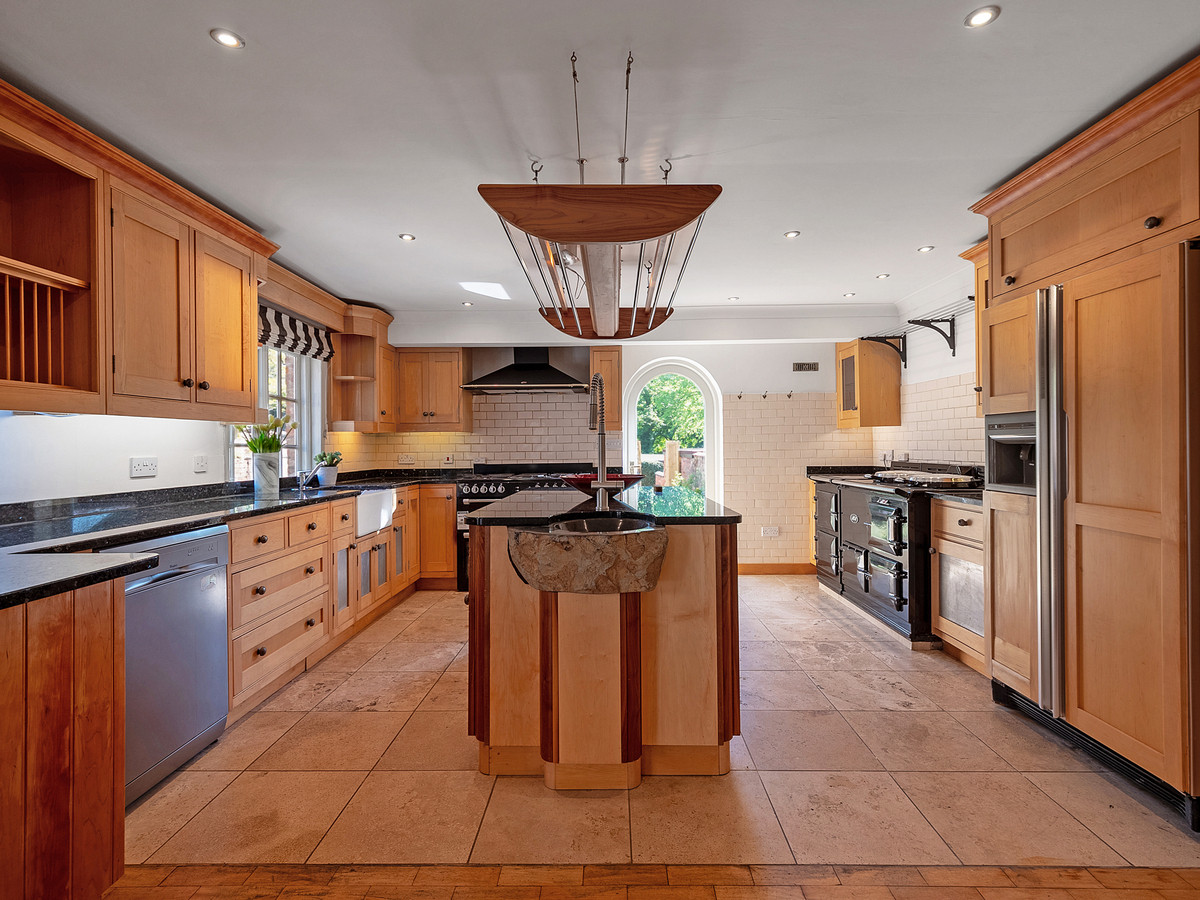 The bespoke maple and walnut kitchen features a central island with unique granite sink, Aga with companion, an additional range cooker, Belfast sink, travertine and parquet floors, built in fridge freezer and dishwasher and provides direct access into the garden via a beautiful arched patio door.