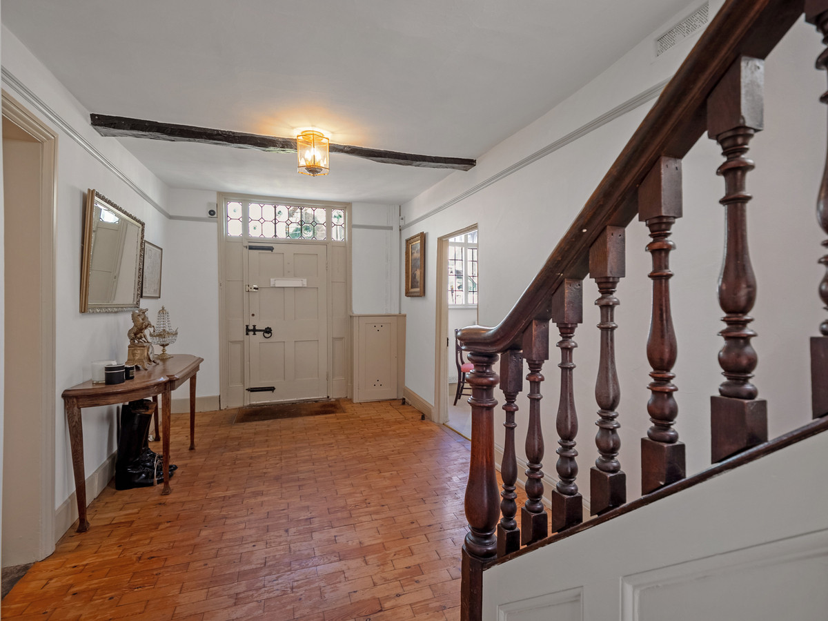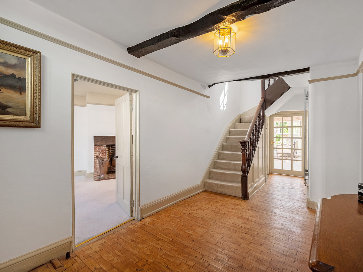 The grand entrance hall with original flooring and period staircase gives access to two large reception rooms to the front of the home. The sitting room on the left is flooded with light from dual aspect windows with leaded windows to the front and sash to the back, exposed beams and a wonderful large open fireplace. To the right is the generous sized living room with parquet flooring, exposed beams, a large open fireplace and recessed shelving. The parquet flooring continues seamlessly passed the downstairs w/c into the dining area of the spacious kitchen with double doors leading to the Orangery.