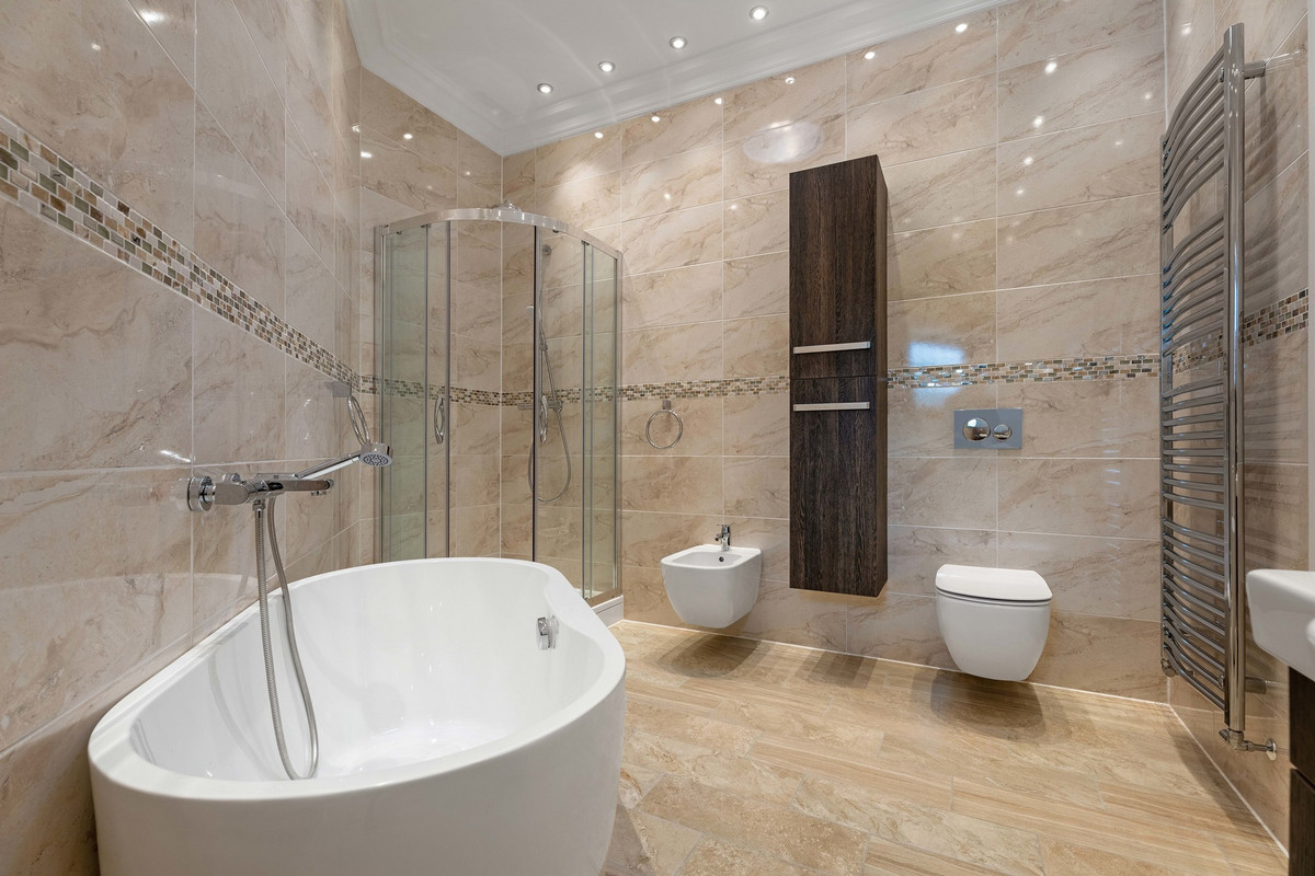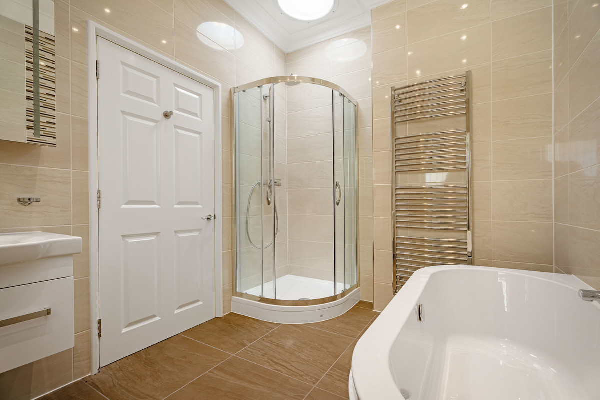 There is a long rear wing off the back of the main living space where you will find the main bedroom accommodation, two good-sized double bedrooms are adjacent to each other and hold ensuite bathrooms. Both of the ensuites hold modern sanitary wear, vanity units, and storage and incorporate separate baths, shower cubicles, sinks, and toilets. Continuing down the hallway of this wing there is storage and French doors onto the gardens and at the end, you will find a beautiful and impressive principle bedroom which incorporates two showers, a standalone bath, his and hers sinks, wall hung toilet, and bidet.