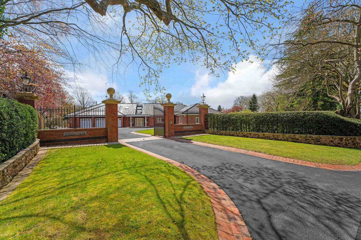 The property is accessed through 7ft high wrought iron electric gates mounted on brick-built columns, finished with pier caps and spheres. A tarmacadam driveway and garaging provide parking for approximately twenty vehicles.
