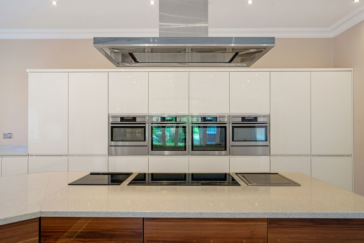 There is a stunning white modern kitchen with an abundance of storage to the front elevation, featuring a sink under the front window, an electric hob with an extractor above, and a double oven. The living space is an extremely generous size, with two sets of bi-folding doors opening out to the gardens. The kitchen dining living room really is the hub of this amazing home. Off to the right, there is a spacious family room which is very light and airy and has French doors out onto the delightful gardens.