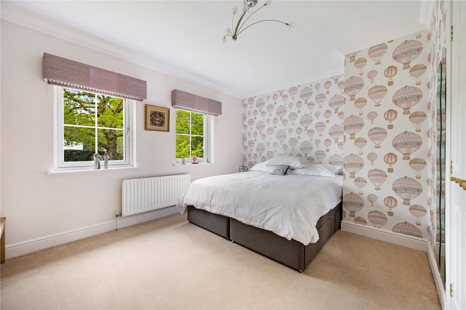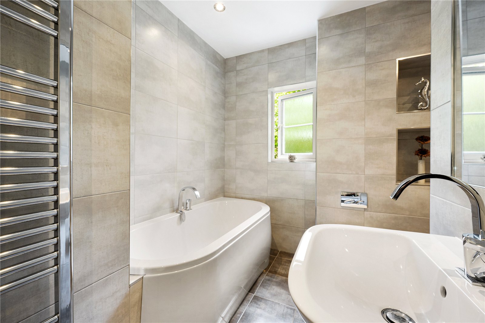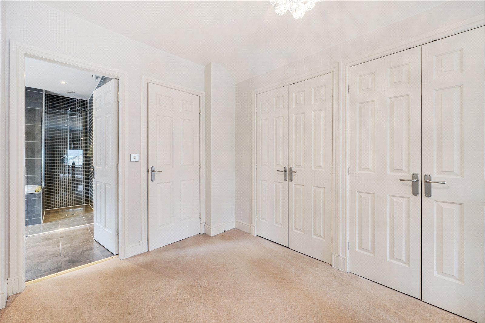 Three additional double bedrooms, two with built-in wardrobes share a stylish house bathroom complete with underfloor heating, a large bath, and walk-in shower. A thoughtfully designed study nook on the landing, with bespoke fittings and views over the park, provides an ideal workspace.