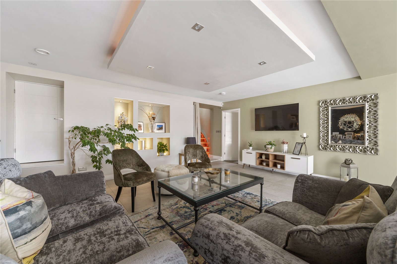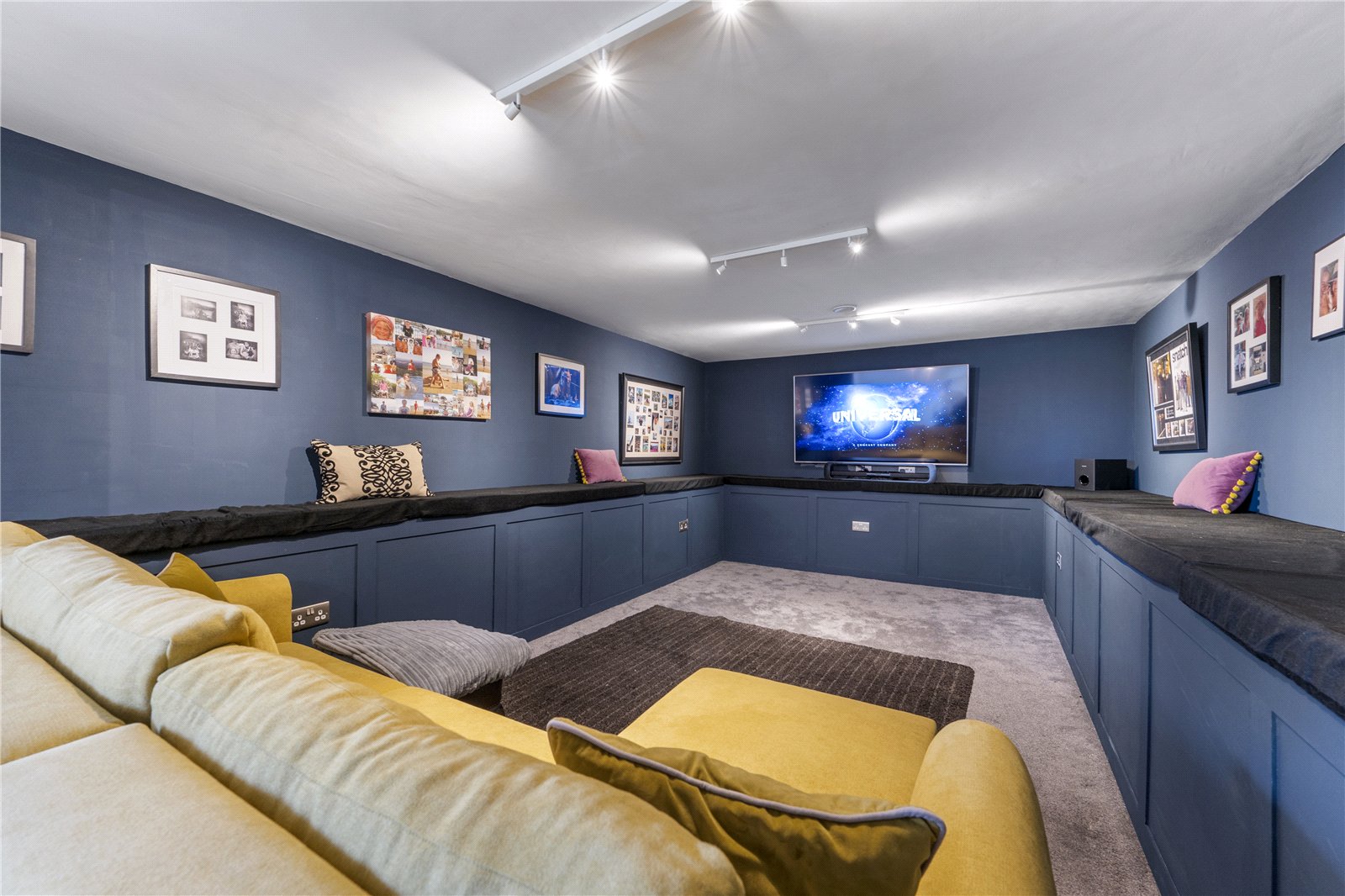 The Canadian Oak staircase with LED feature lighting leads to the amazing lower ground floor with Italian porcelain tiled flooring with zone underfloor heating and high specification lighting throughout. There is a generous family room for entertaining with a bar area with an integrated fridge, granite work tops, fitted floating shelves and additional storage. Leading on from here is a fabulous sunroom with lovely window seating, a skylight roof, fully tiled flooring with underfloor heating and patio doors with access to the rear garden. Three further bedrooms compliment this lower ground floor, one currently used as a gym and another as a study. The third bedroom features a great dressing room with excellent hanging space and a modern en suite with stone tiled flooring and Italian wall tiles comprising a vanity unit, wash hand basin with mixer taps, w.c., a considerable size walk in shower. This would make an ideal teenage suite or annex as it has its own entrance door. This wonderful home also has the added advantage of a bespoke cinema room ideal for entertaining and relaxing with family and friends.