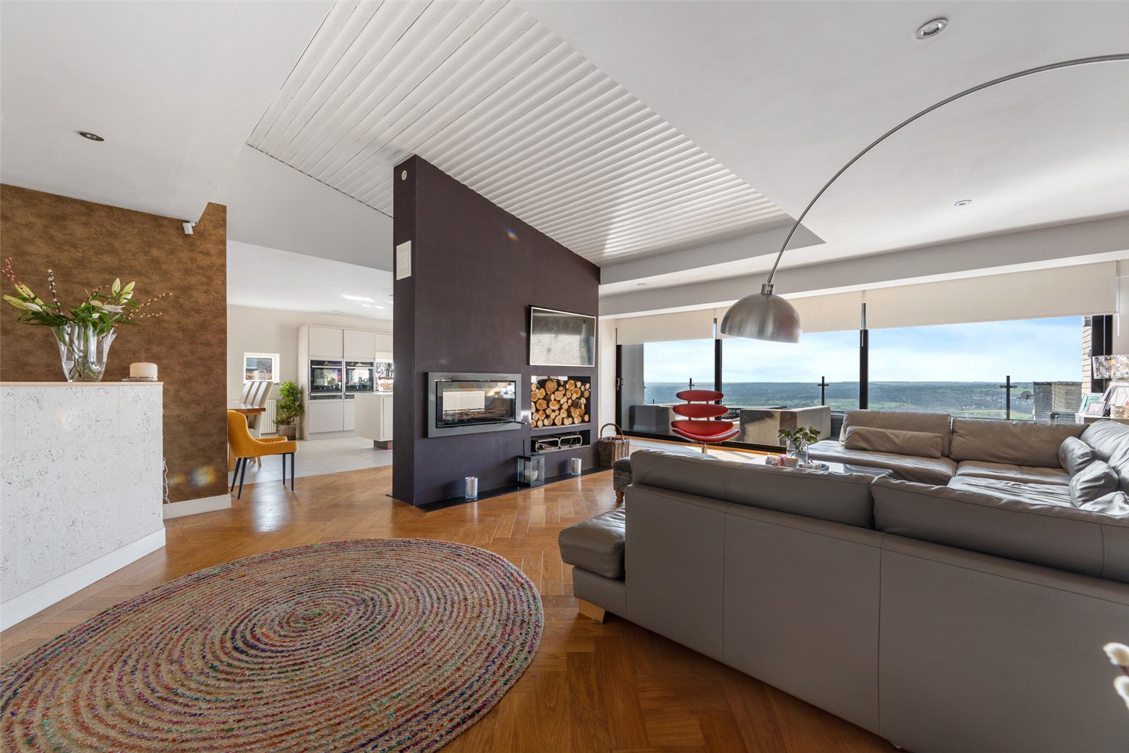 At the heart of this property is this magnificent open plan living and dining kitchen which has been fitted to a high specification and appointed with the finest range of appliances. The living area has beautiful, Canadian Oak flooring and a unique feature wall. This wonderful room has a dual feature log burner and sliding doors providing access onto the balcony with a glass balustrade, where you can relax and take in the fabulous views of the rear garden and beyond. The stunning dining kitchen has bespoke wall and base units, Caesarstone and granite work tops, Italian porcelain tiled flooring, a lovely breakfast bar with inset prep sink and Cessar stove. There is an integrated Hotpoint dishwasher, Franke hot water tap, Neff double oven, warming drawers and Neff induction hob. From the kitchen a door leads to the utility room with fitted wall and base units, granite work tops, Italian porcelain tiled floor, inset one and a half bowl sink with mixer tap, plumbing for a washing machine and dishwasher and access to a useful pantry.
