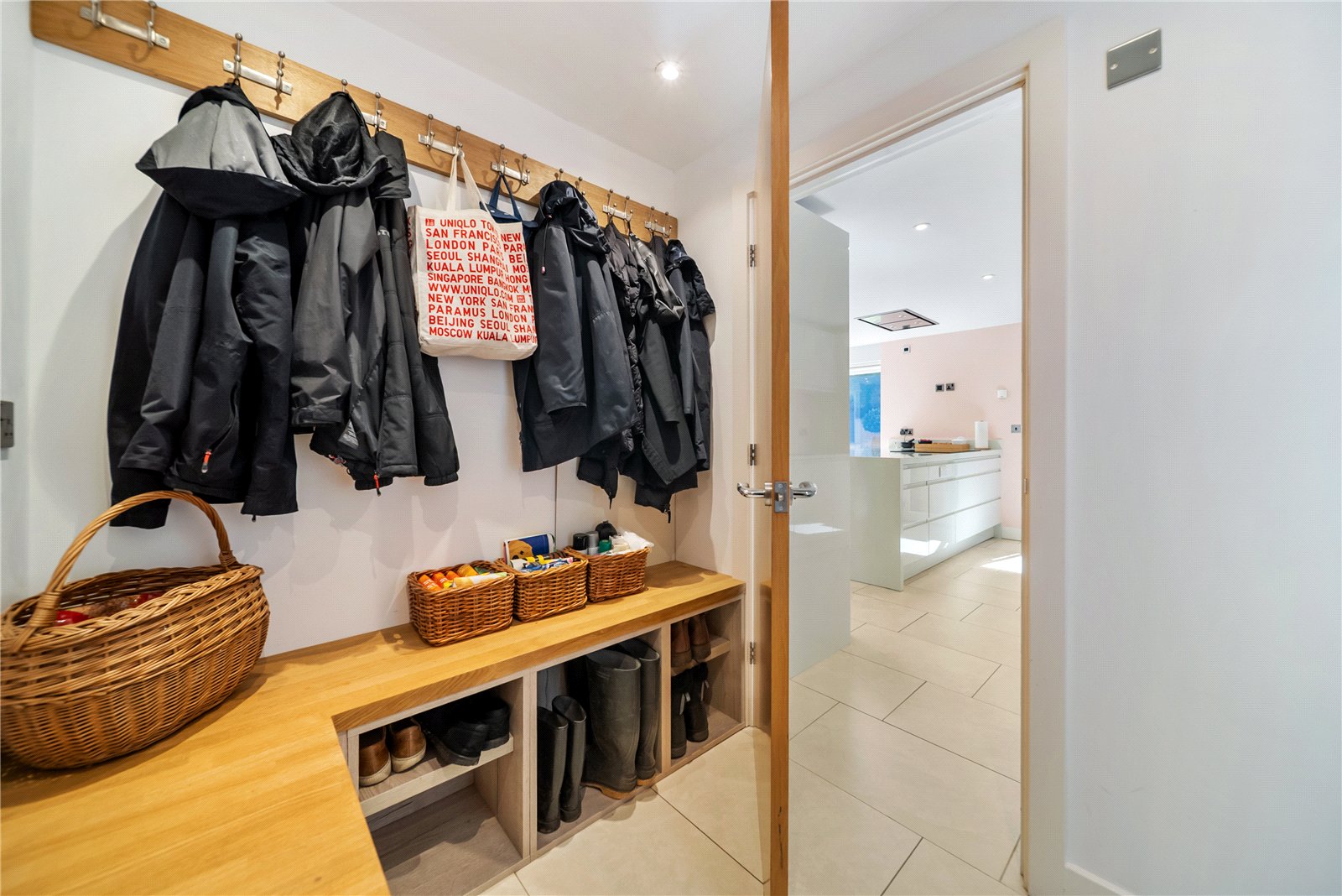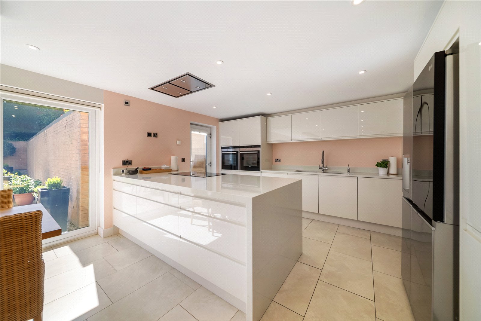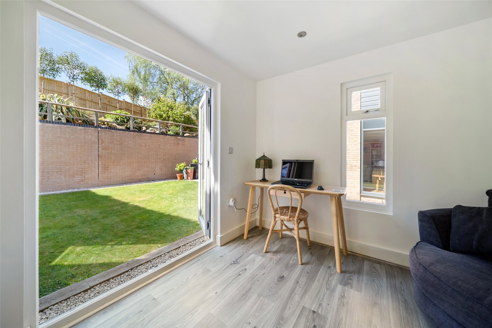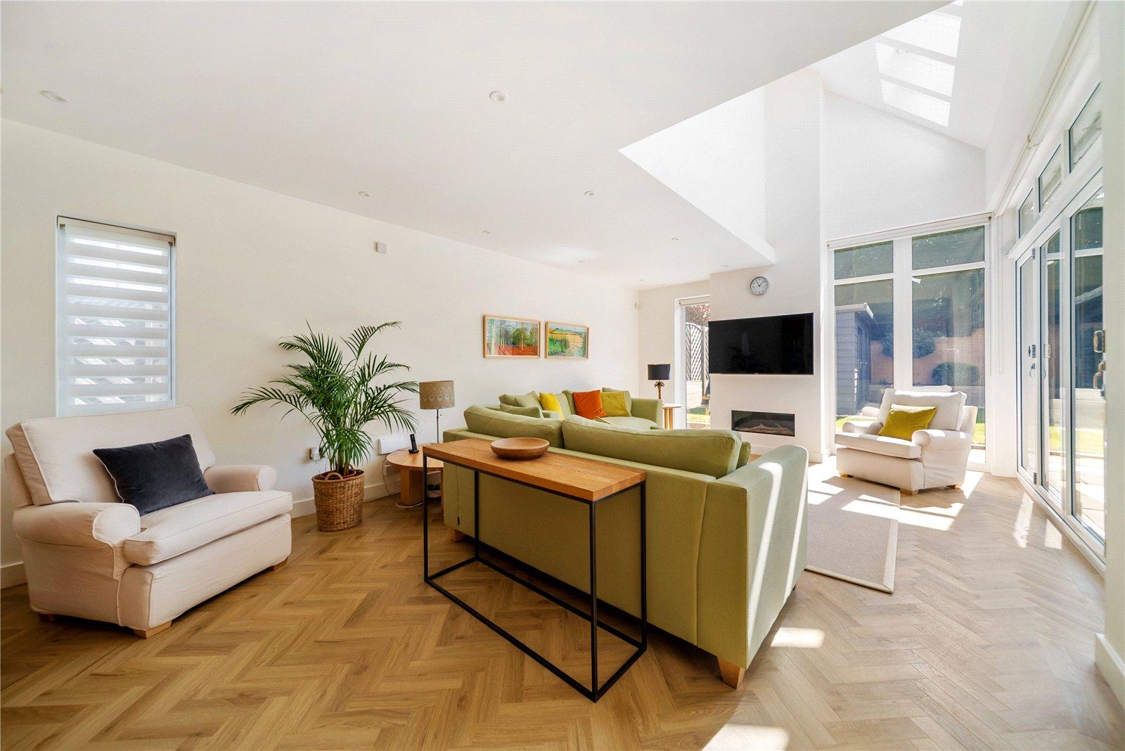 The living room is equally impressive, with striking vaulted ceilings and Velux windows that flood the space with natural light. Rich herringbone flooring adds a touch of classic elegance and a second set of wide bifold doors connect this luxurious space to the garden, making it perfect for both relaxed family evenings and entertaining guests.