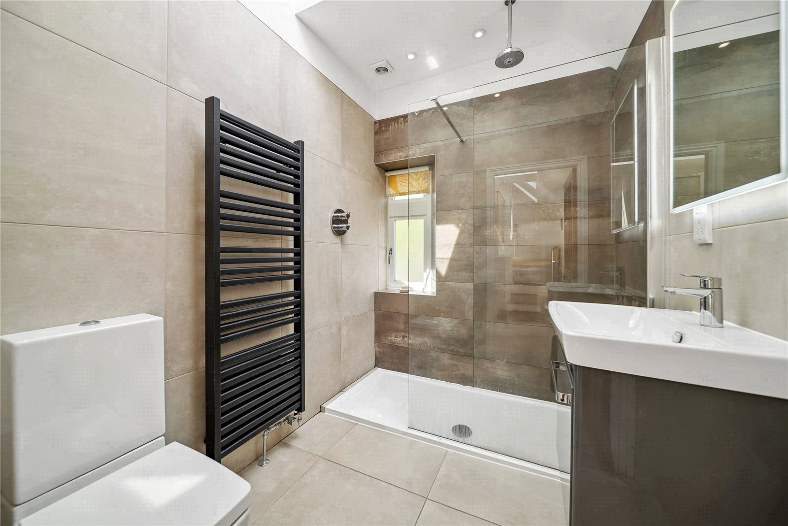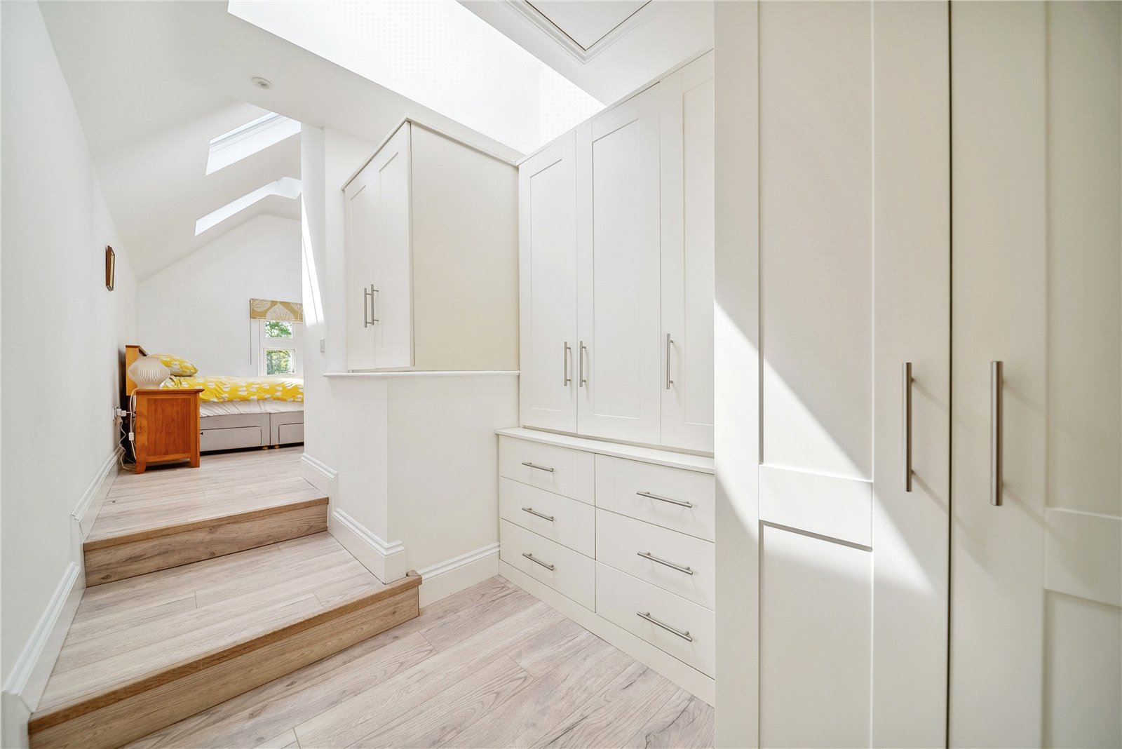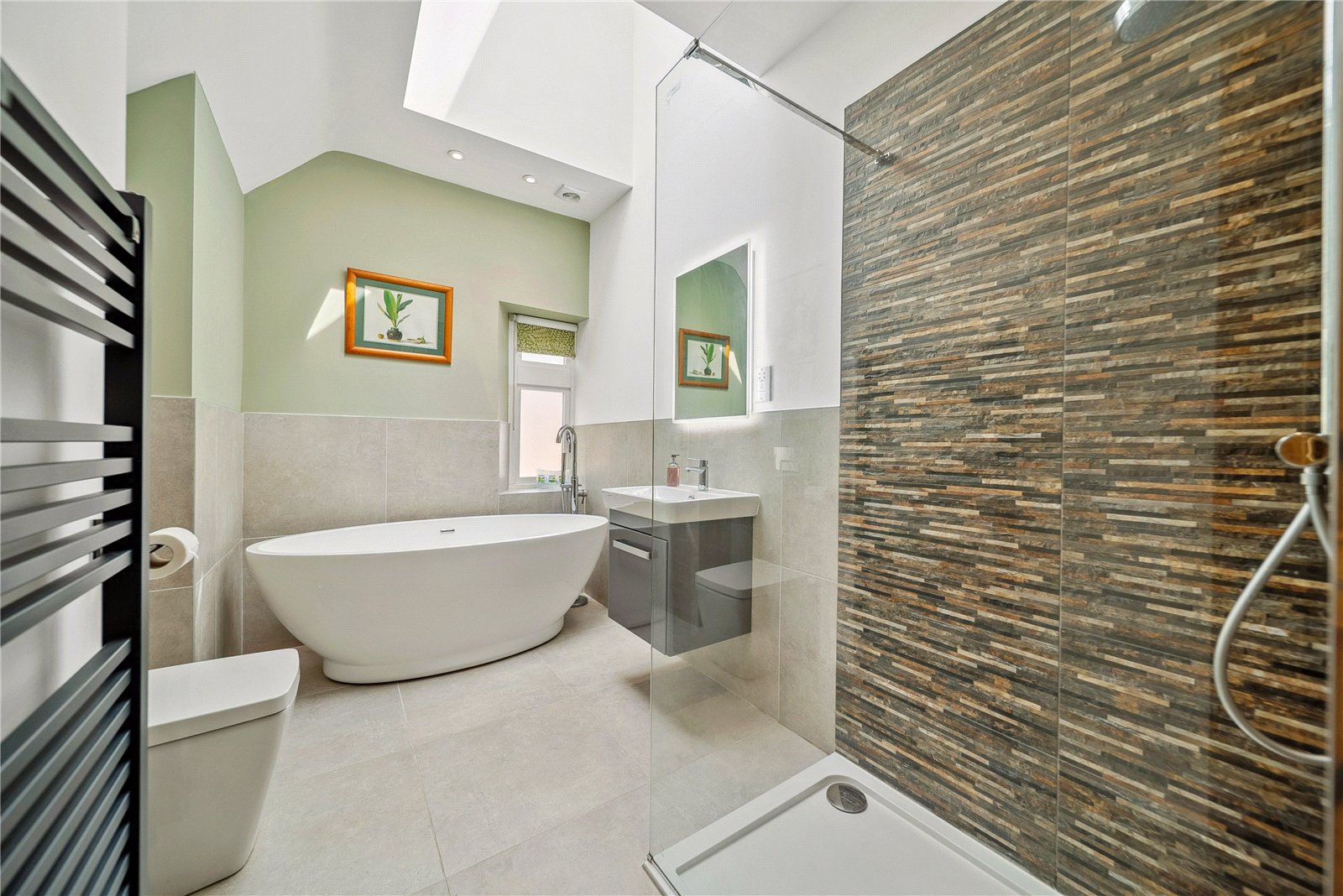 The principal bedroom is a true highlight, sophisticated and serene, it features bespoke fitted wardrobes, a striking log-burning stove, and an elegant ensuite bathroom with a walk-in shower, offering a sense of calm and indulgence at the end of each day.