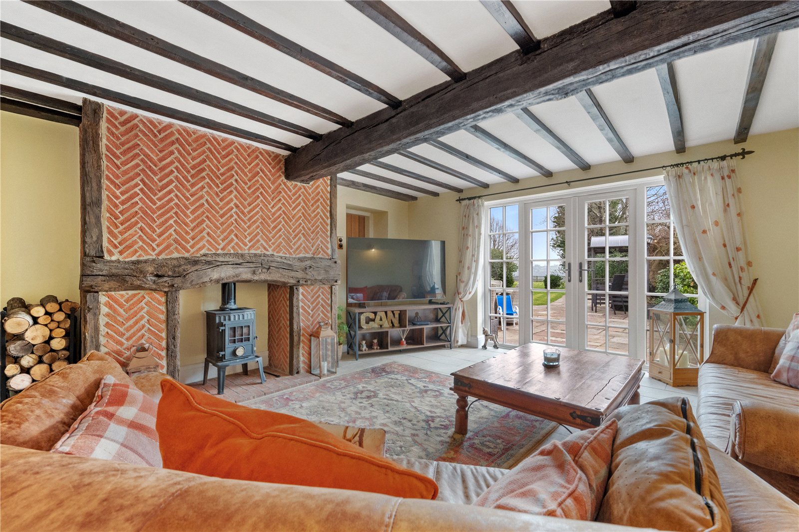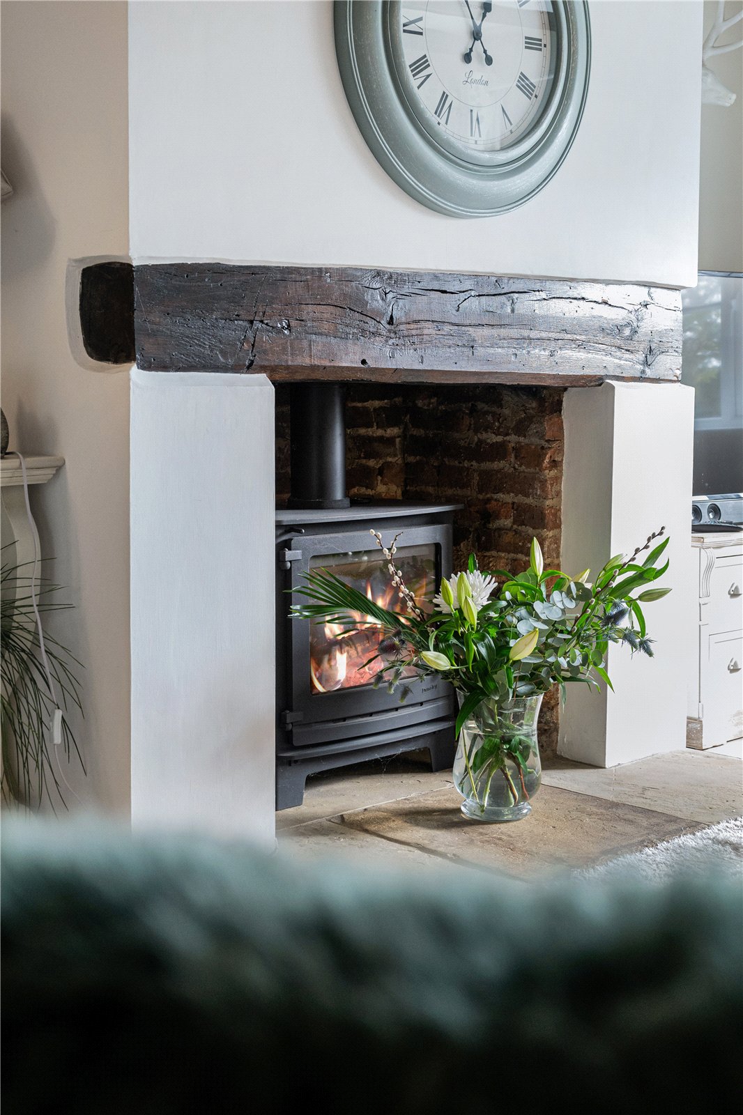 Adjacent to the kitchen is the inviting dining room, offering a perfect setting for family meals and entertaining guests. This rooms features a wood-burning stove, enhancing relaxation and comfort. The space flows seamlessly into the reception room, where original beams and a further wood-burning stove create a warm and welcoming atmosphere. The home also features a snug with an original 1700s working fireplace, providing an additional space for relaxation and cozy gatherings.