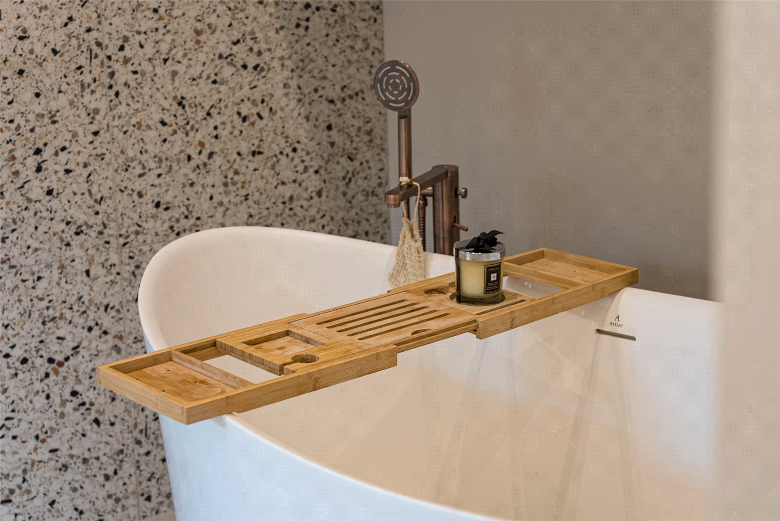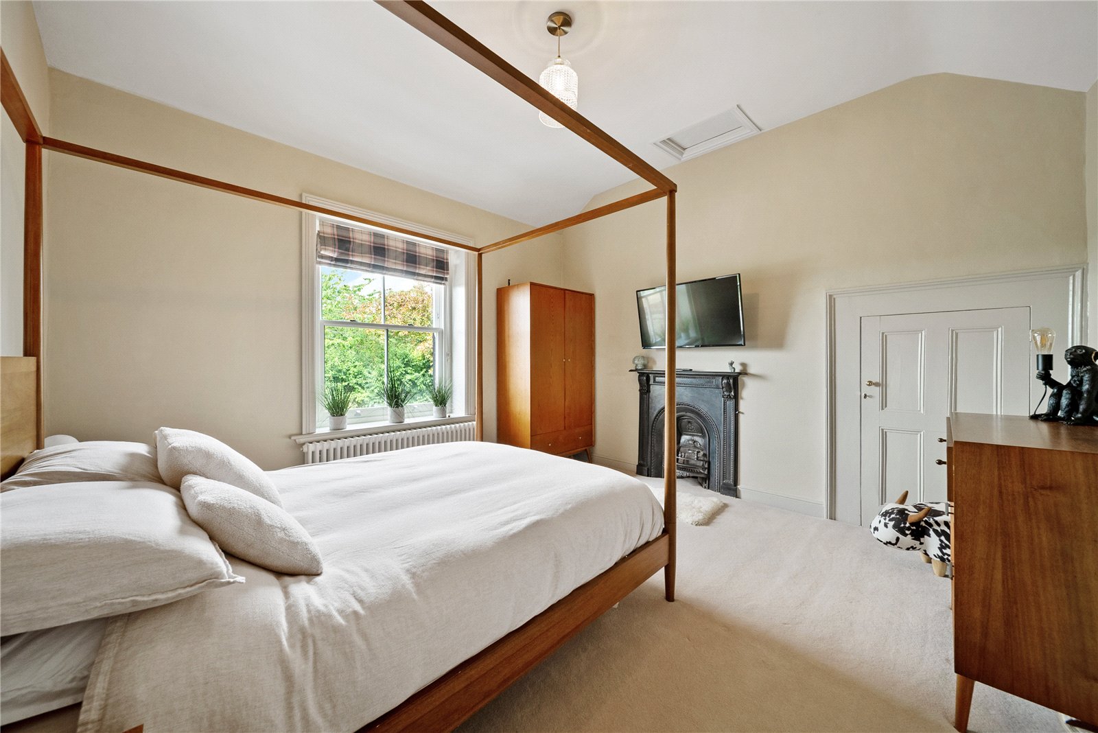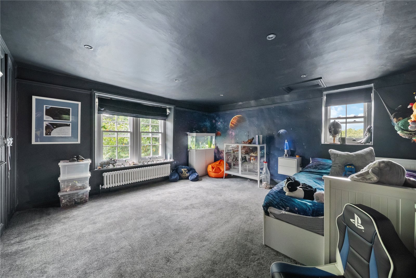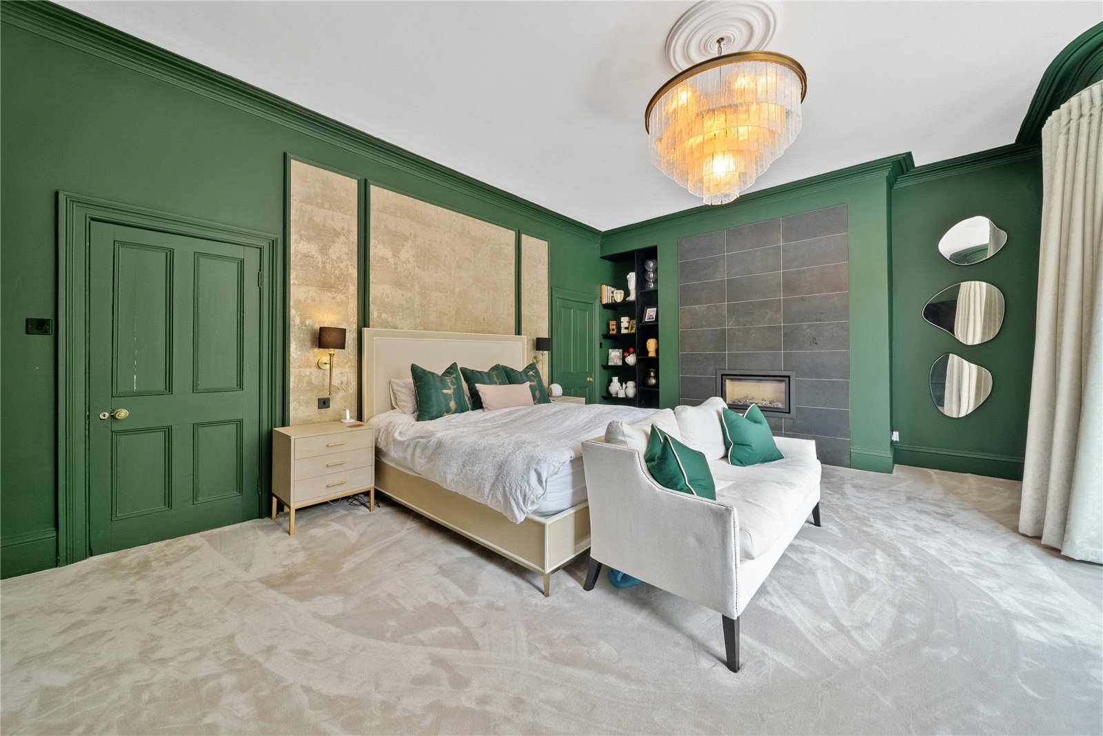 Upstairs, the property boasts five beautifully presented bedrooms, each with its own unique character. The main bedroom features a panelled feature wall, a built-in electric fire, and bay windows overlooking the grounds. It also benefits from a luxurious en suite with a double sink vanity and a walk-in shower. A stylish house bathroom serves the remaining bedrooms and includes a freestanding bath and walk-in shower.