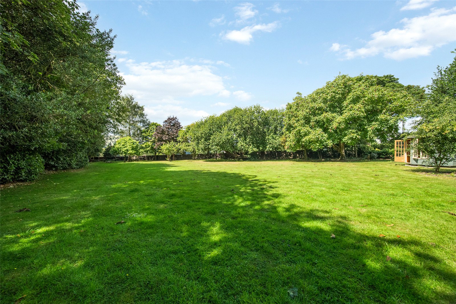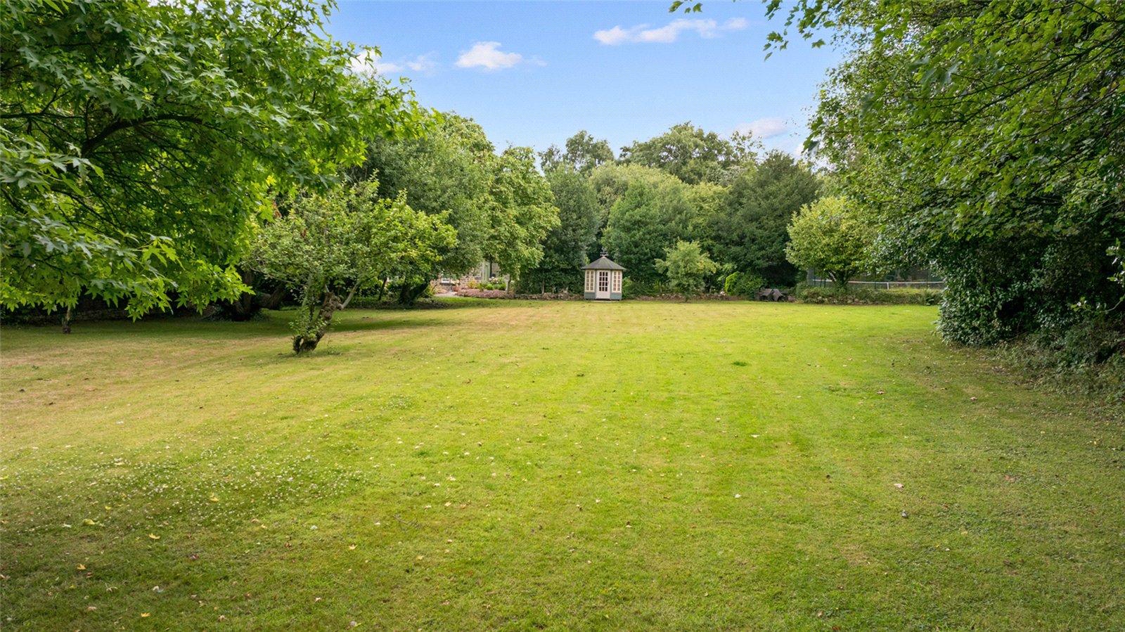 The rear garden is predominantly laid to lawn, interspersed with mature trees and well-established shrubs and bushes, providing a high degree of privacy. A raised terrace offers the perfect spot for summer relaxation or entertaining, while a charming Anderson shelter makes a useful and quirky space for log storage.