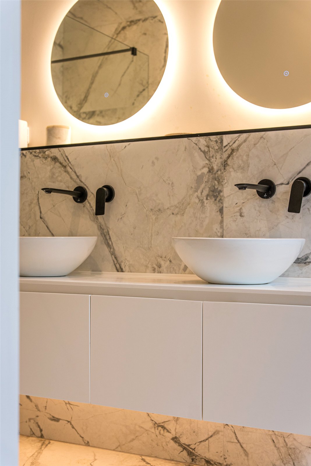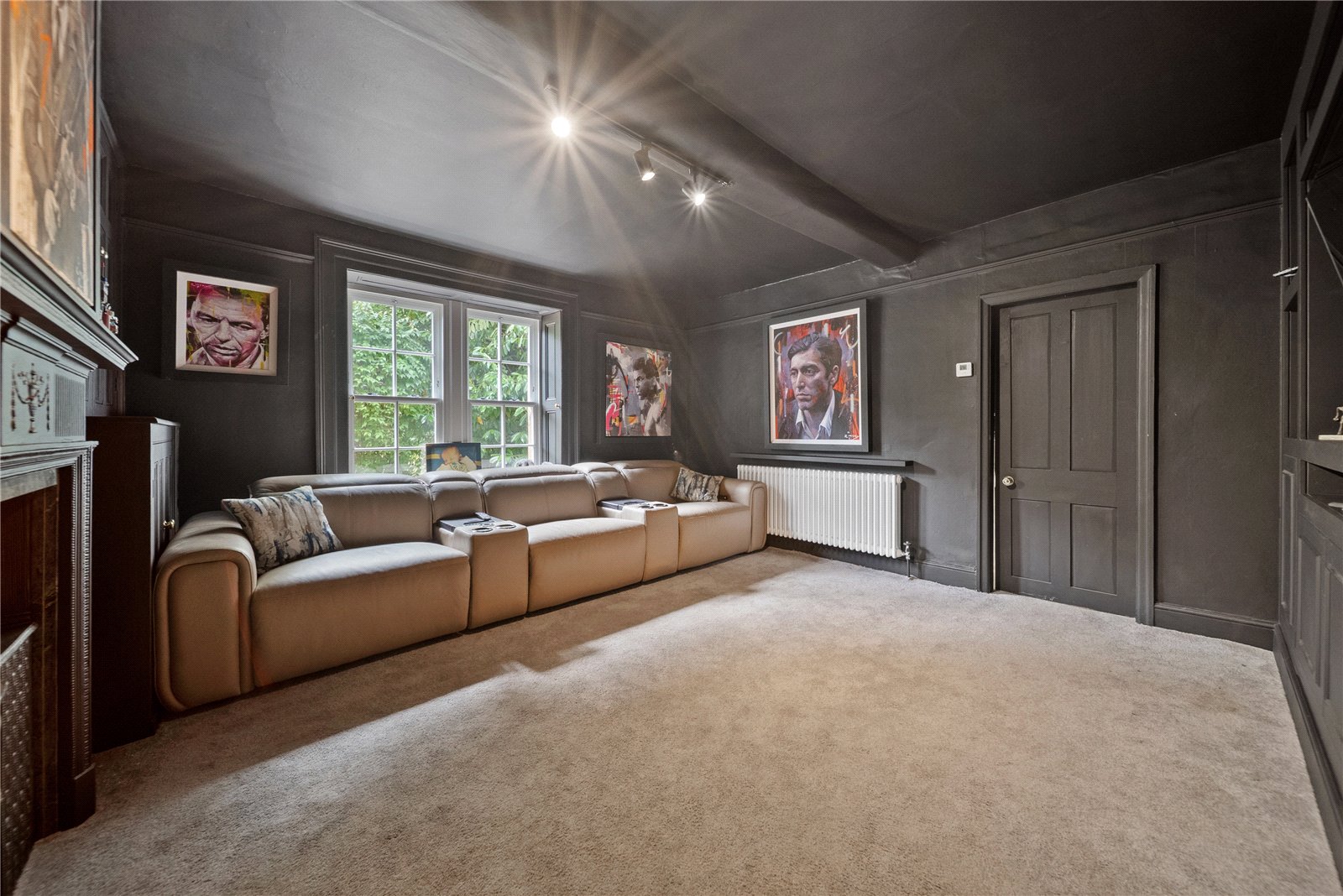 The ground floor of the main house offers an abundance of living space, with six generously proportioned reception rooms, including a cinema room leading into a home office, a formal lounge and a stylishly rebuilt glass dining area that opens out into the gardens. The entrance hallway is finished with bespoke wall panelling and graceful archways, setting the tone for the rest of the property. A thoughtfully designed dog shower room adds a touch of practicality, and there’s even access to a private wine cellar for the discerning collector.