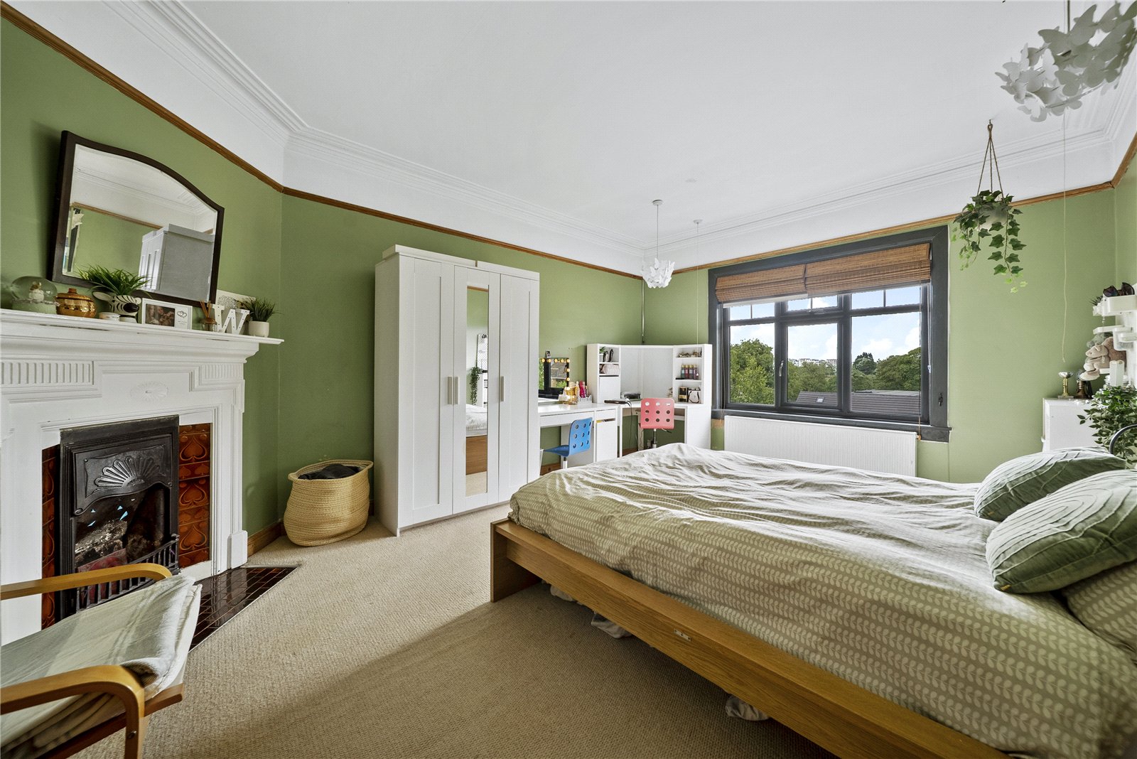 Upstairs, the main bedroom is a serene retreat, complete with fitted storage, a luxurious ensuite featuring double sinks, a walk-in shower, and an original fireplace. The second bedroom also features its own period fireplace, continuing the theme of timeless character throughout the home. The main bathroom offers a touch of boutique luxury with a freestanding bath and walk-in shower. Two further double bedrooms finish the first floor, perfect for everyday living.