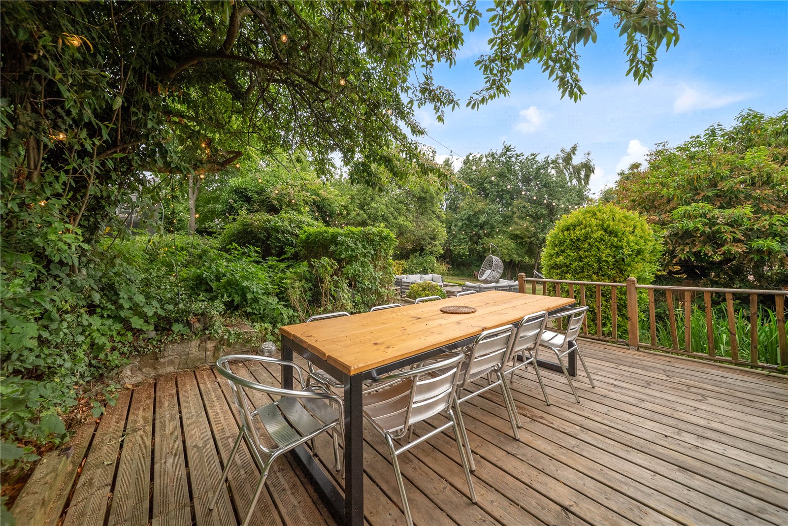 Step outside into an enormous rear garden, with two separate decking areas, one perfect for al fresco dining, the other ideal for outdoor lounging, with sofas plus a patio space and plenty of lawn for children to play, this garden is truly made for entertaining, relaxing, and family life.