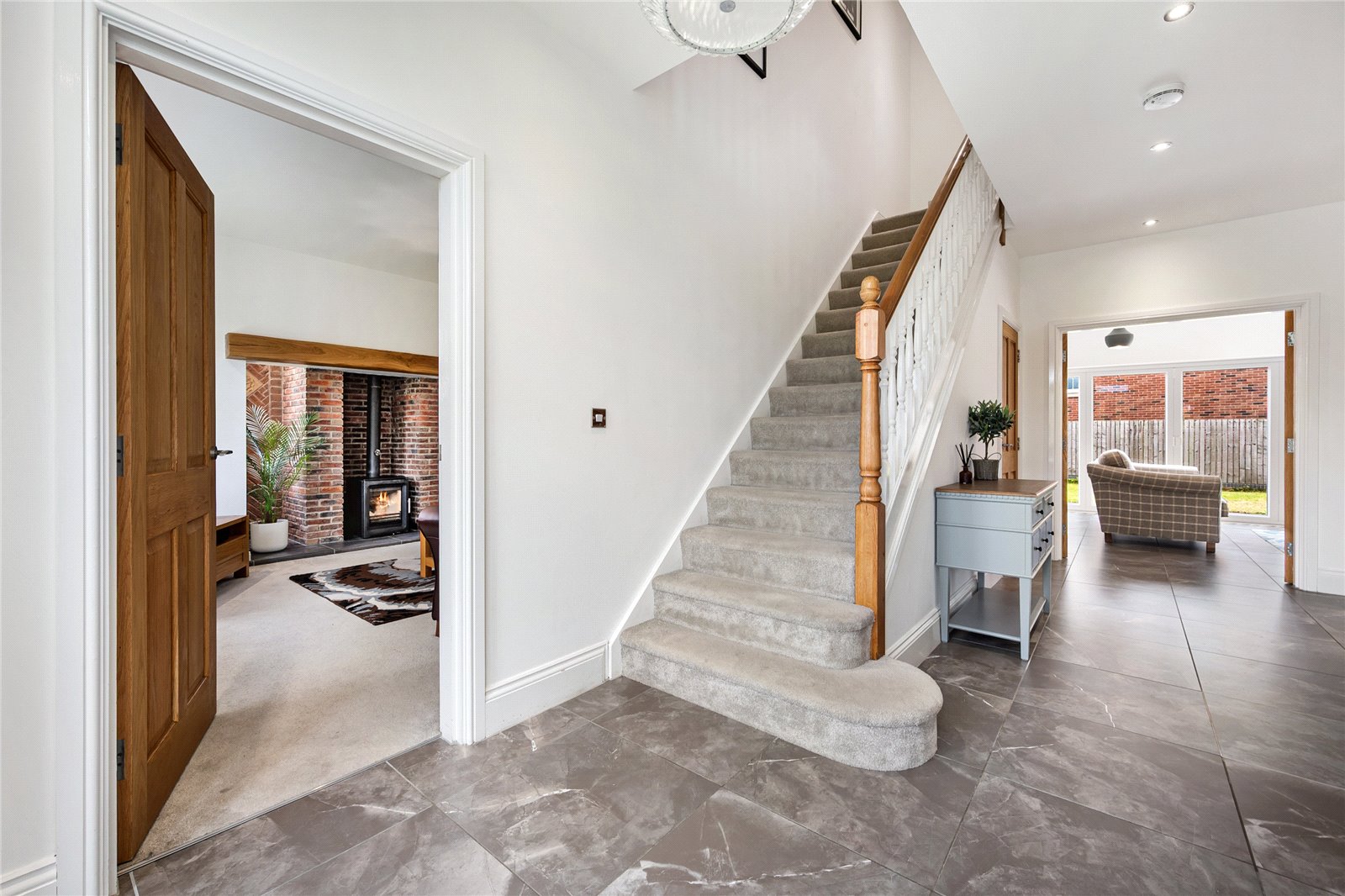 As you step through the front door, you are welcomed by a spacious and inviting hallway that sets the tone for the rest of this home. To the left, you'll find a cozy lounge which features a fabulous log burner, perfect for relaxation, and convenient under-stair storage. On the right, adjacent to the kitchen is a charming dining room bathed in natural light, and a utility room which provides practical space and access to a side door.
