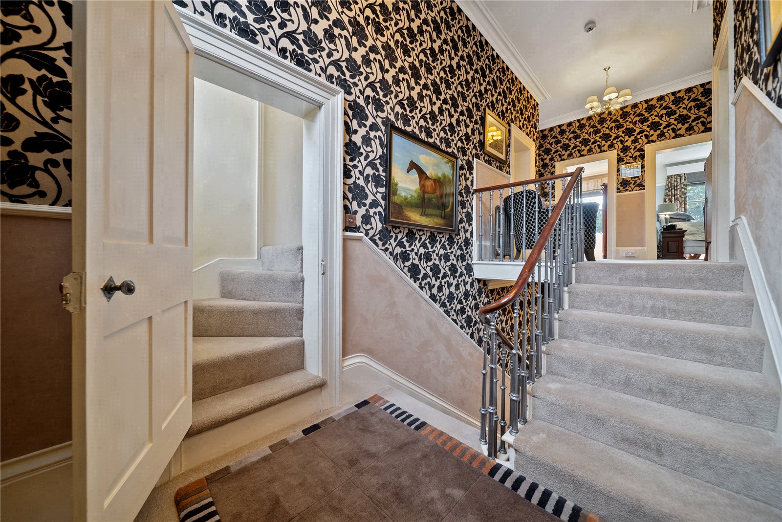 Spen Hall is approached via two electric gated driveways. The private upper drive meanders past mature gardens and a rare weeping ash tree, while the lower drive – shared with Rose Cottage and two other converted buildings – leads through manicured grounds, bordered by tall hornbeam hedges to the rear courtyard complete with formal parterre garden and stone patio. The outdoor space is as impressive as the house itself, Formal lawns, historic woodland blooming with bluebells and wild garlic, and two imposing stone staircases framing the giant rockery, give the garden a stately feel. There is also a fruit garden beside a natural spring, vegetable plots, a summerhouse, potting shed, and even an aviary that formerly housed peacocks. A gym with glass double doors sits at the end of a picturesque colonnade which borders the extensive stone flagged main patio.