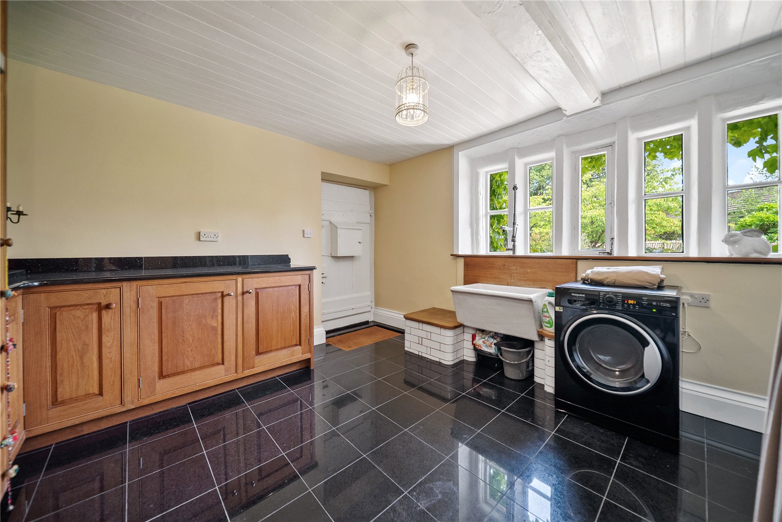 The bespoke kitchen is a chef’s dream, fitted with oak cabinetry by Clarity Arts, half bullnosed granite worktops, a white Aga with matching cabinetry, and a statement Lacanche range cooker. A pantry provides access to the first of two vaulted cellars and a strongroom. The second leads to a utility/boot room housed in the oldest part of the home, complete with mullioned windows, a wood burner, granite worktops, the second cellar, and a hidden staircase that ascends to a charming, vaulted office with exposed beams and oak flooring.