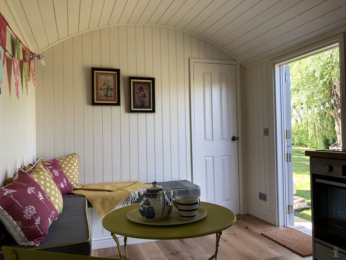 Alongside Hares Furrow, Under Willows is a traditional style shepherd’s hut, that is also run as a holiday let. Newly built by Riverside Shepherd’s Huts and positioned within the orchard, the cleverly designed accommodation includes a living kitchen, a generous shower room and bedroom. There is also a tranquil outside seating area complete with chiminea and hot tub.