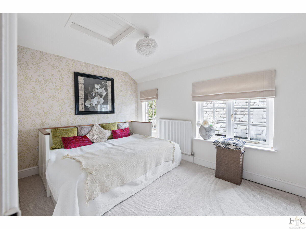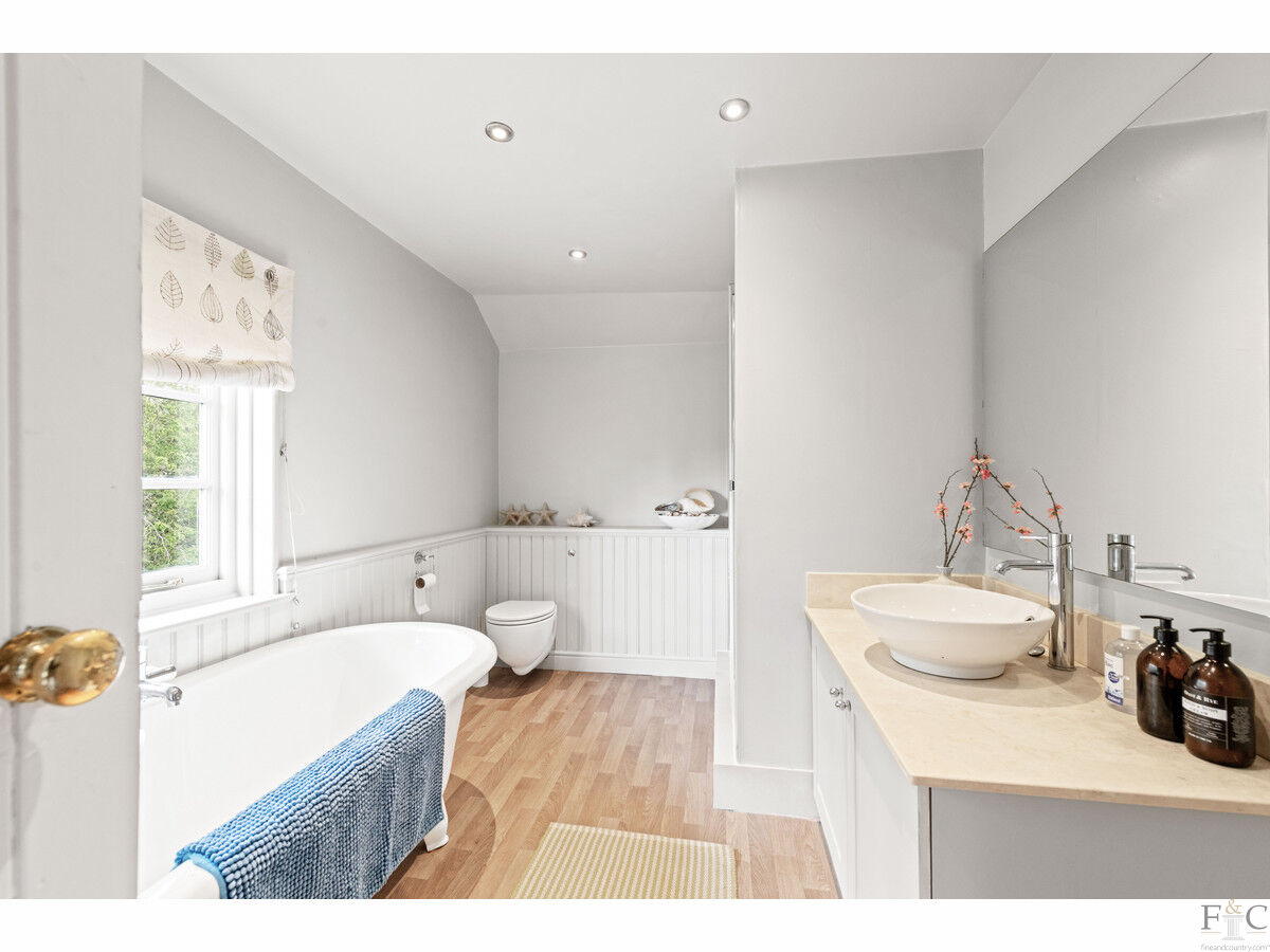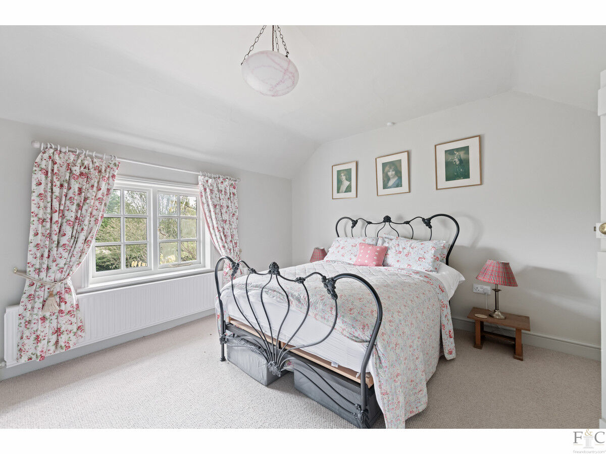 On the first floor, the dual-aspect master bedroom offers uninterrupted views over open countryside and Burton Overy village, positioned to create a master wing. It features an adjacent four-piece bathroom that includes a freestanding bath, while bedroom five serves as a dressing room. Additionally, a dual- aspect guest room with its own ensuite bathroom, along with two further bedrooms that share access to an additional bathroom.