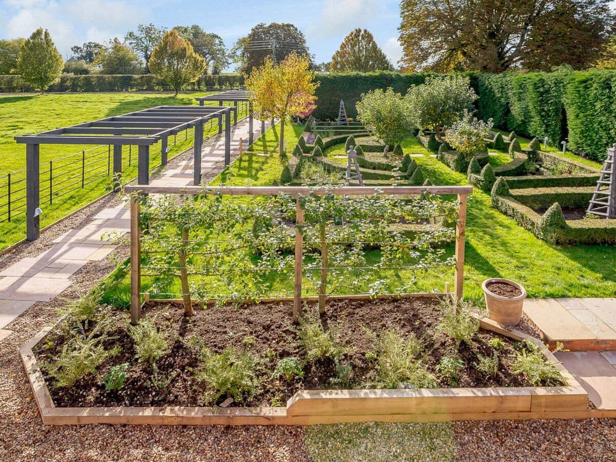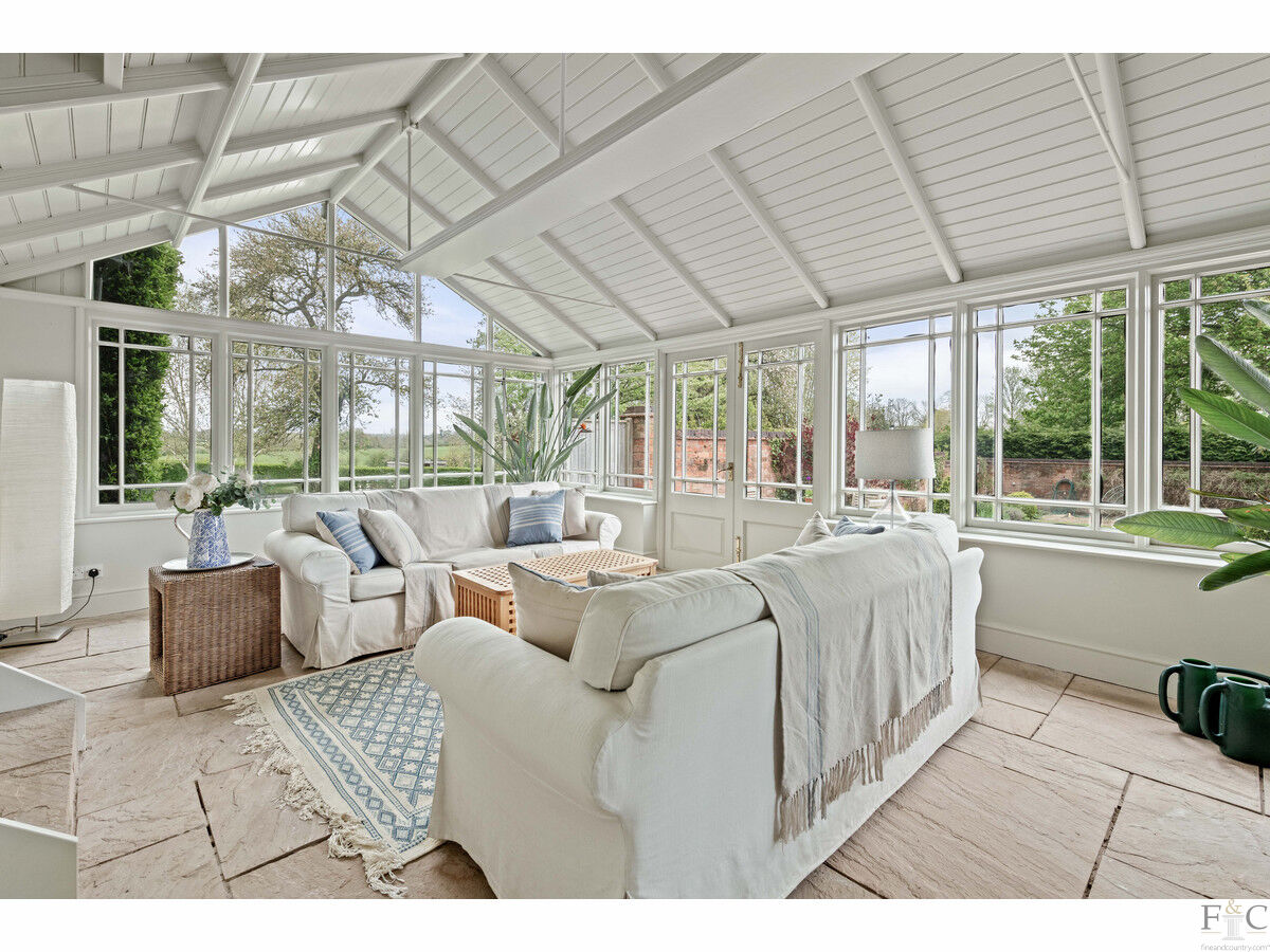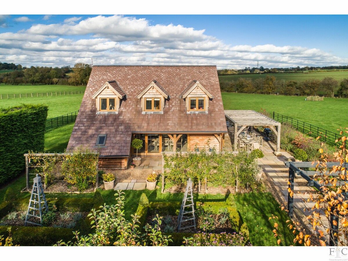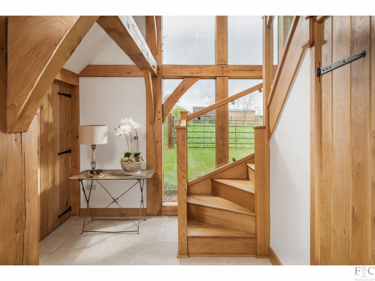 included in the sale, is a charming oak-framed property built by Oakwrights in 2019, with six years remaining on its build guarantee. Currently run as a boutique holiday rental, the well-proportioned accommodation is beautifully presented and spans two floors. The ground floor includes an entrance hall with fitted cloak cupboard and utility room, a spacious double bedroom with ensuite bathroom, and a stunning open plan living area, featuring a fully equipped kitchen, dining space, and lounge. A striking double-height glazed window illuminates the hallway and stairwell and frames the picturesque countryside views that surround the property. To the first-floor are three further double bedrooms all with ensuite facilities. Hares Furrow is nestled within its own private grounds and features a delightful knot garden with espalier fruit trees, and a wonderful terrace with a pergola overlooking the paddock, that is an excellent outdoor entertaining space.