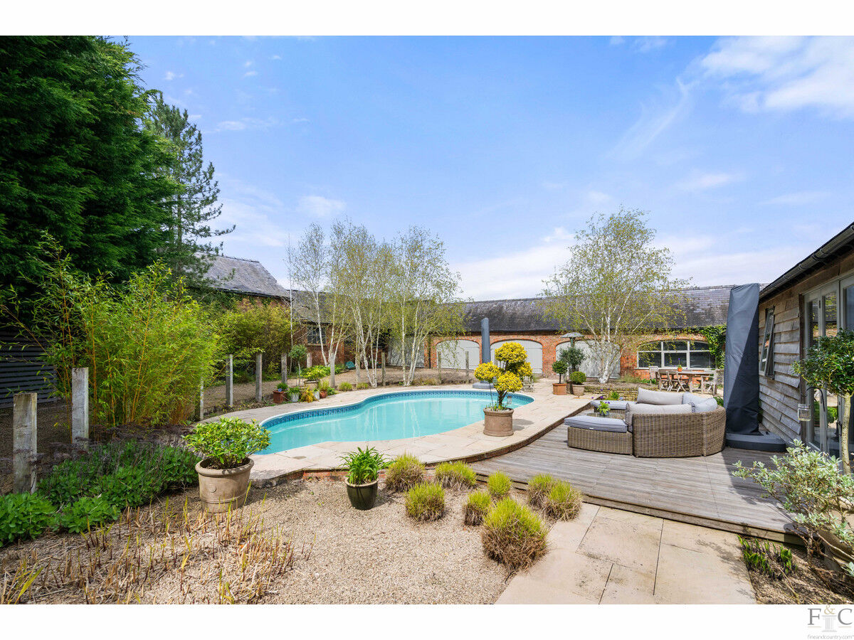 The property is accessed via a long gravel driveway, providing ease of movement and adding an attractive design element. Continuing to the rear of the house, the drive leads to garaging for three vehicles and additional storage. At the rear of the property, a sheltered landscaped terrace features a heated swimming pool, creating a fabulous outdoor space. A beautifully planted walled garden provides a private, tranquil retreat, while a side garden with an orchard enjoys views over the adjoining 3.5-acre paddock (STM), which benefits from mains water.