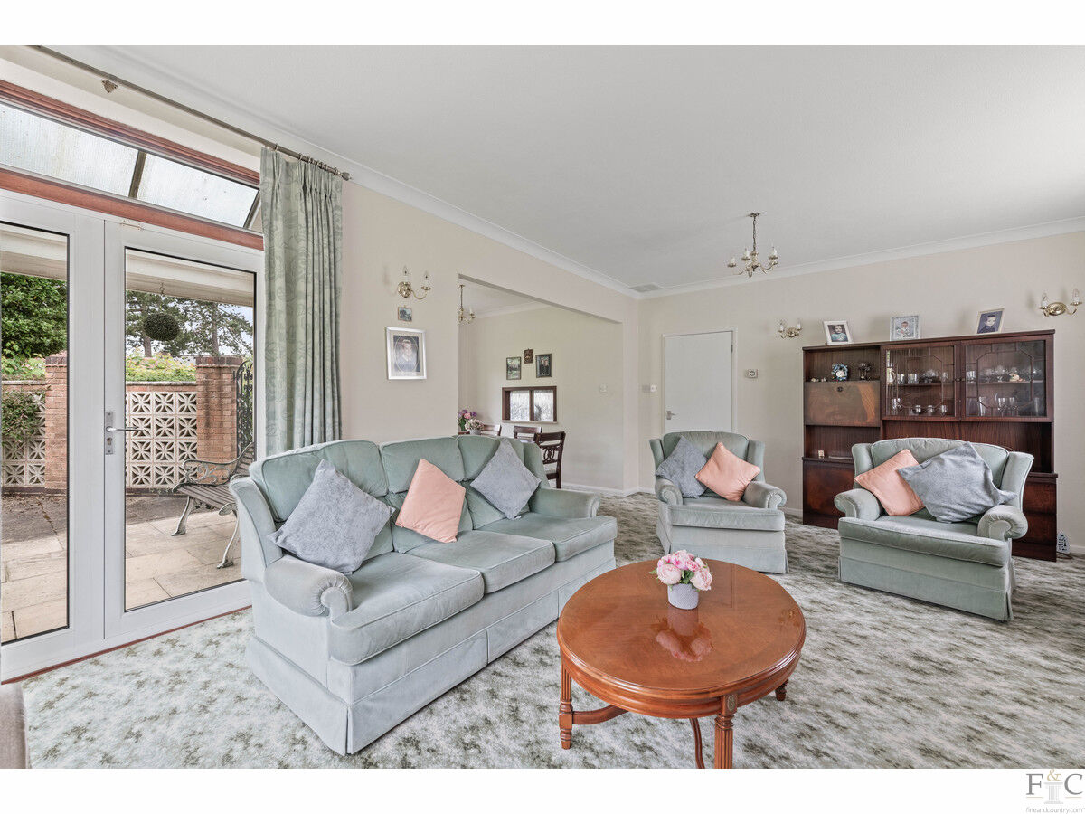 Through a glass porch doorway, the bungalow opens into a carpeted entrance hall, acting as the main thoroughfare to all rooms within the property. It has ceiling coving, white painted skirting boards and similarly matched internal doors. Immediately to the left, the spacious lounge and dining area provides delightful views into multiple parts of the garden and easy access through patio doors. Light and airy, this L shaped space has a feature fireplace and easily accommodates furniture to subdivide the room into designated areas, with wall and ceiling light fixtures in generous supply.
