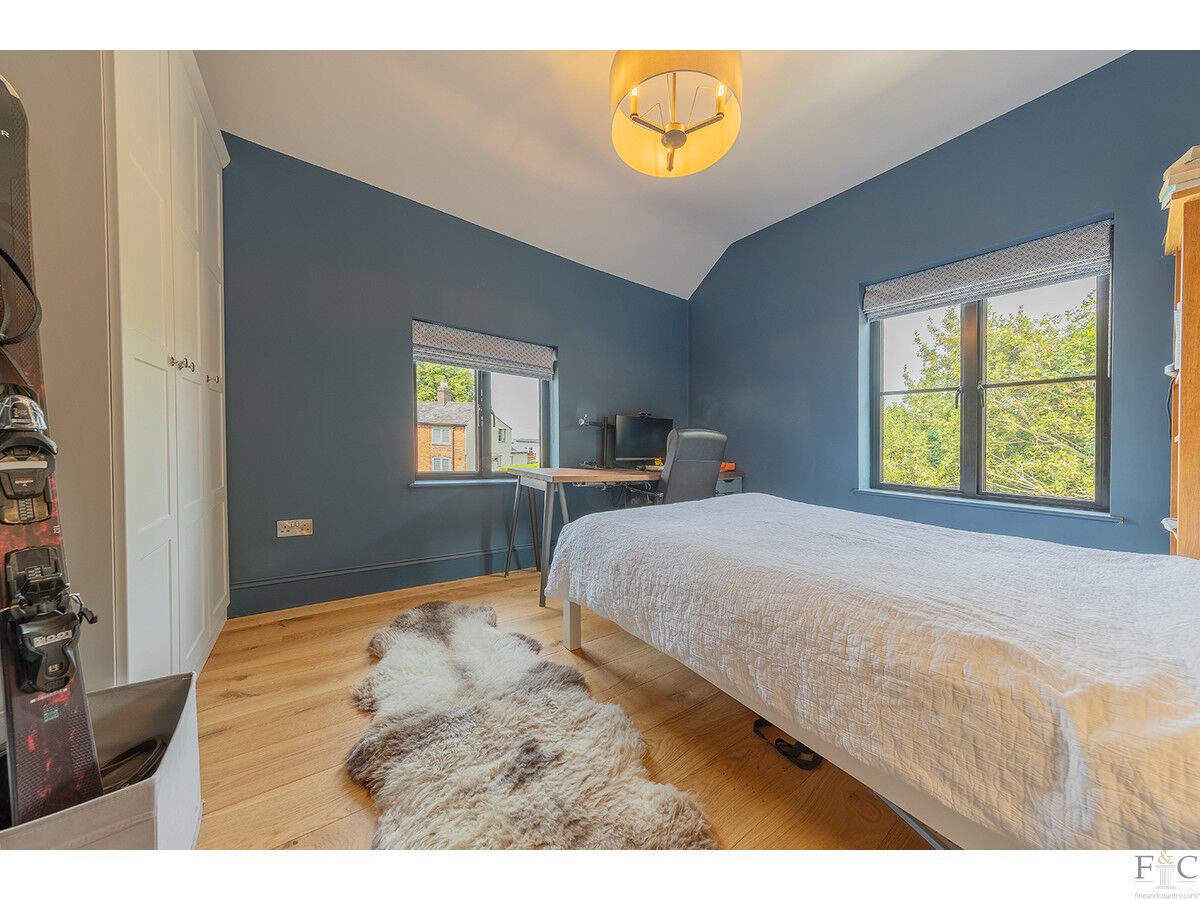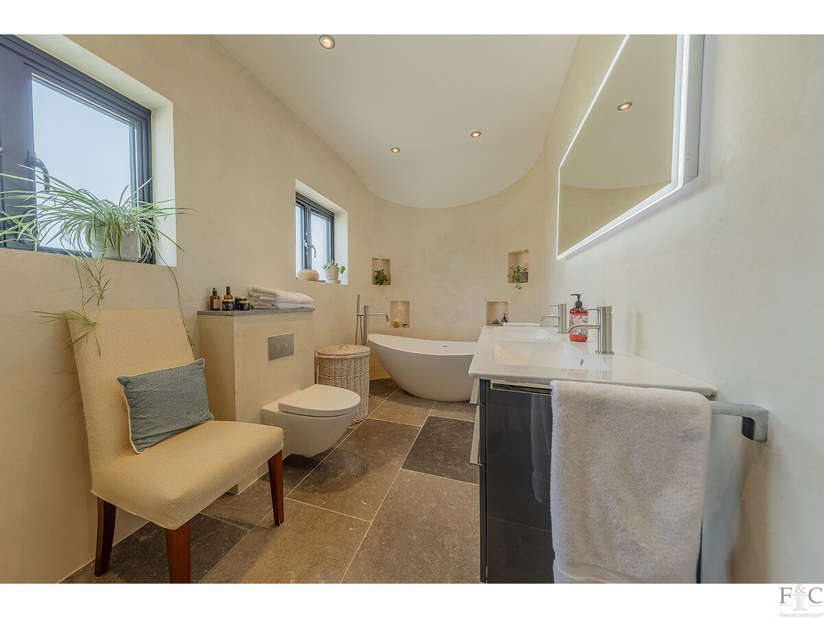 Upstairs, a galleried landing leads to three elegant, dual-aspect double bedrooms. The principal suite is a sanctuary of calm, complete with a fitted dressing room and a luxurious ensuite featuring venetian plaster walls, a freestanding bath and a double walk-in shower. A further family bathroom echoes the same elevated finishes and thoughtful design.