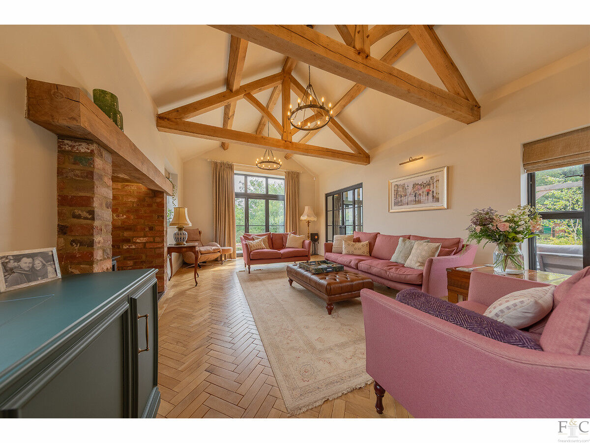 - Vaulted triple-aspect lounge with exposed beams, wood-burner, and garden views