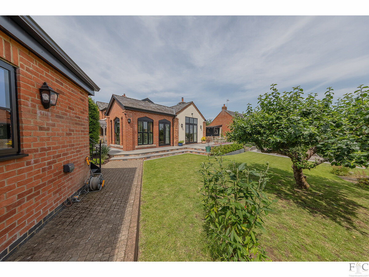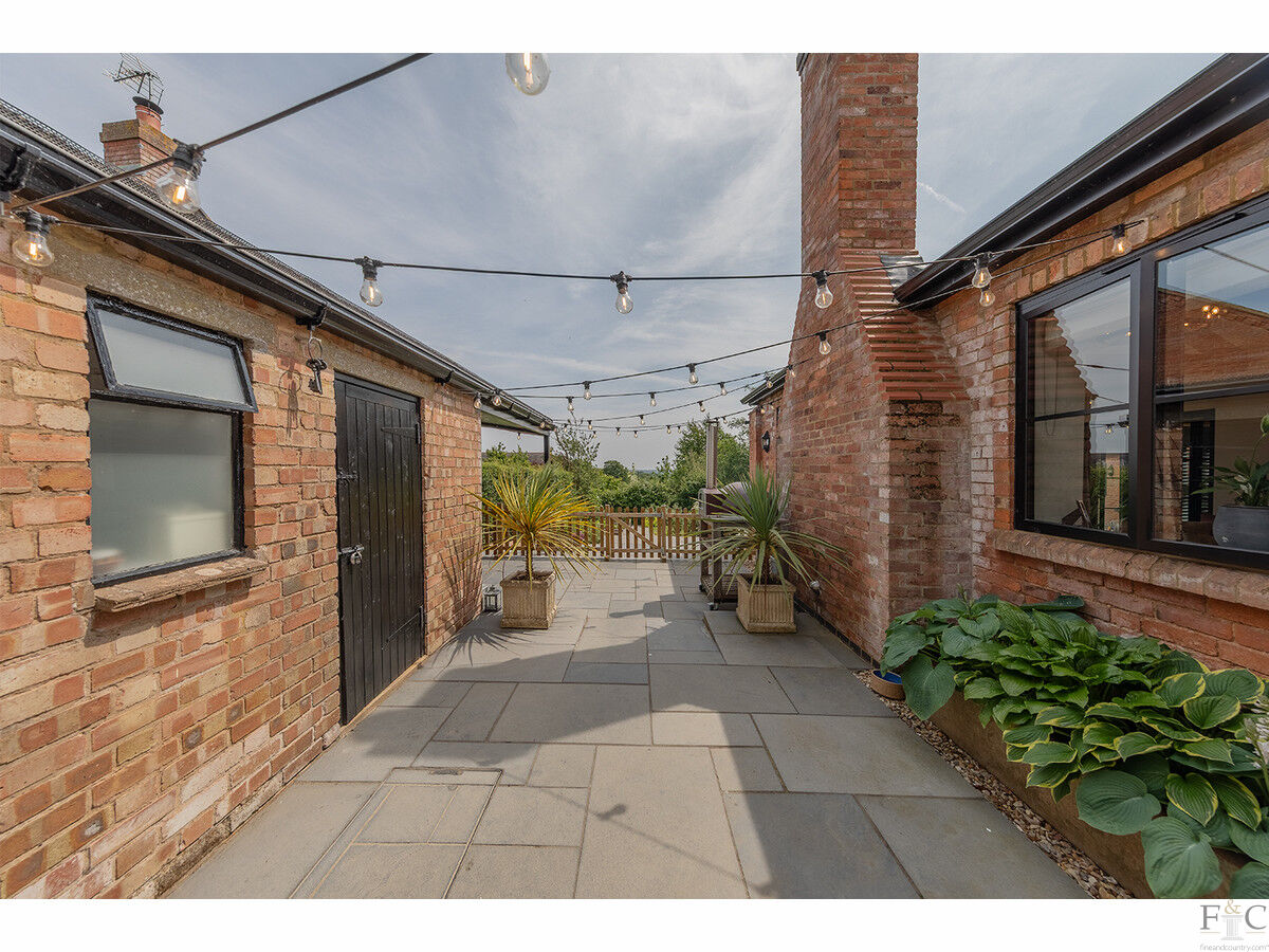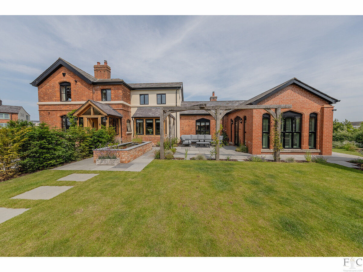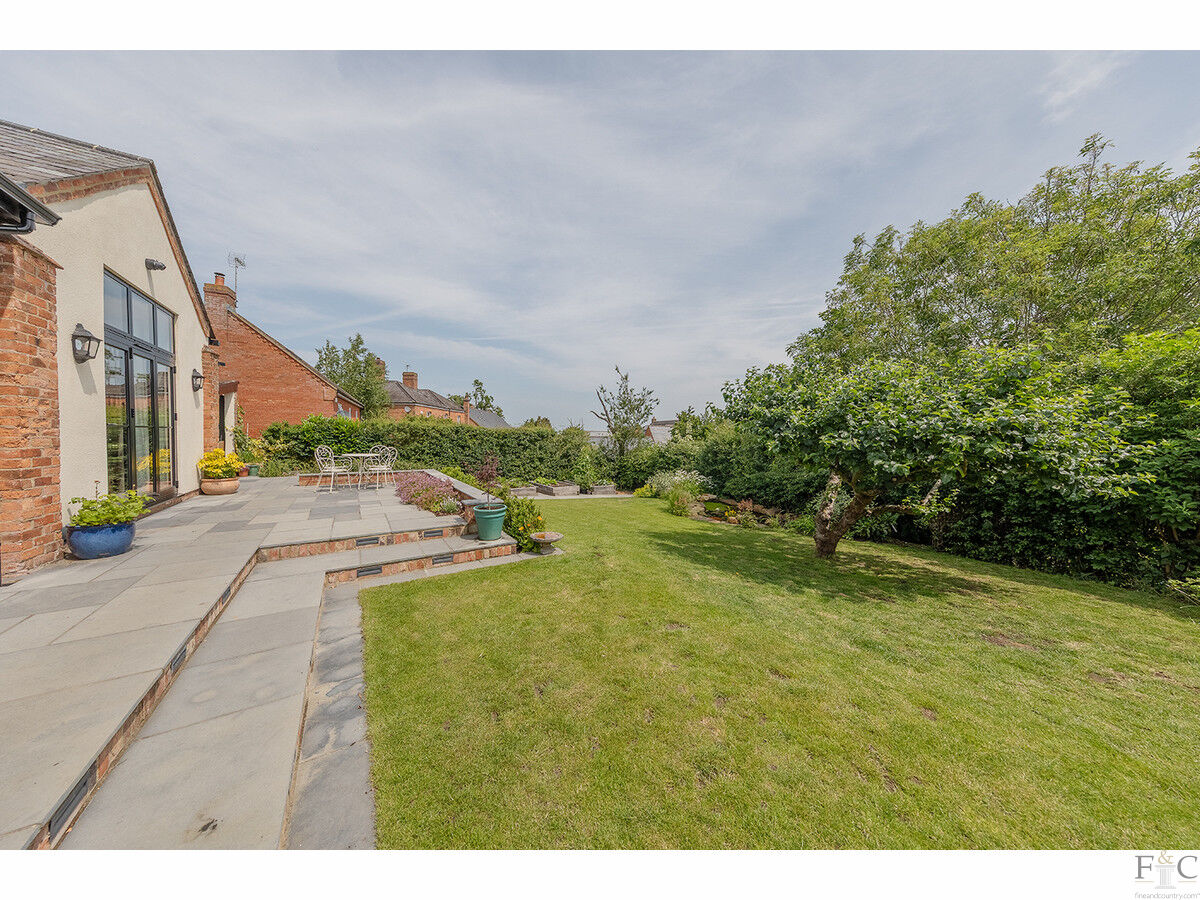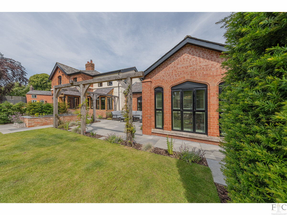 The gardens have been professionally landscaped to create a private and beautifully considered outdoor space, with neatly edged lawns, a mature apple tree, raised beds, and planted borders. A south facing terrace features a raised pond and a pergola, and ambient garden lighting enhances the setting, creating a magical atmosphere for evening entertaining.
