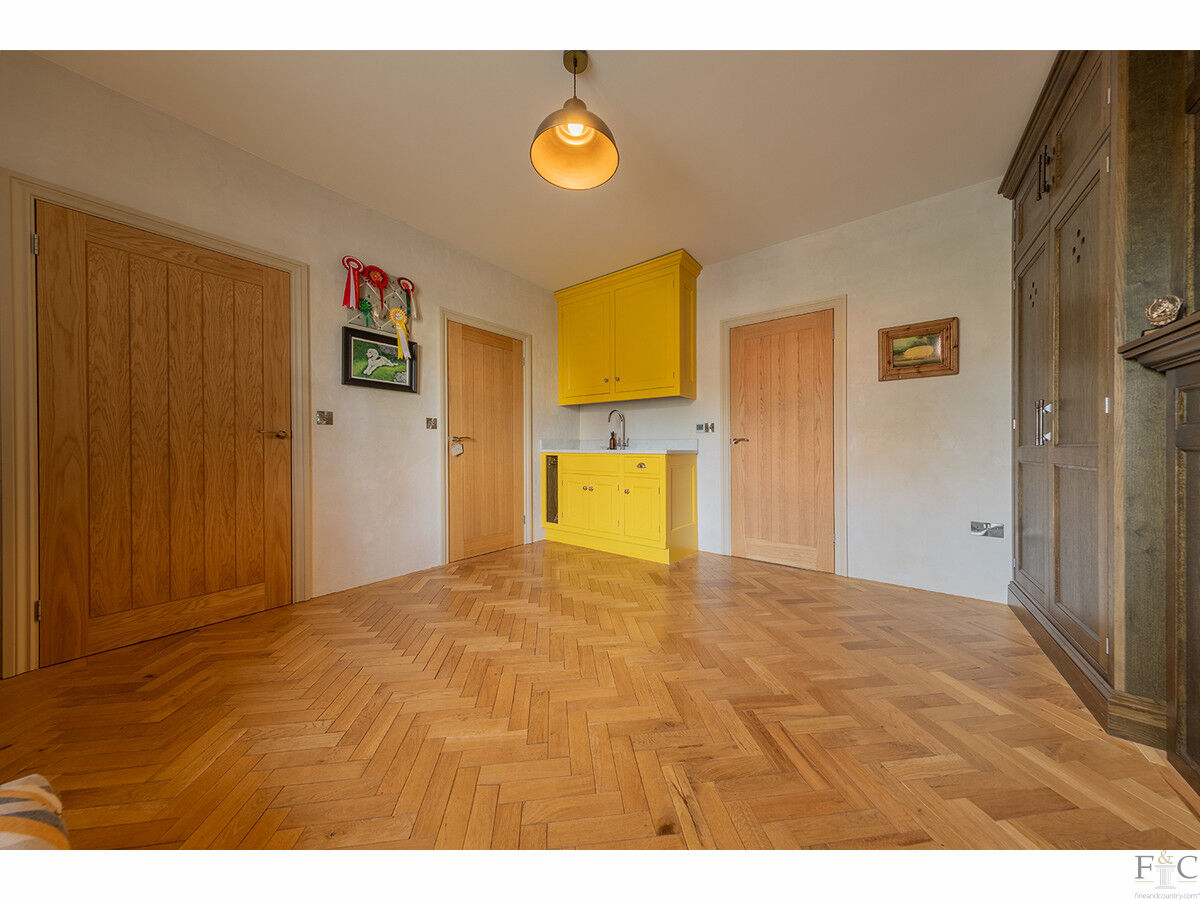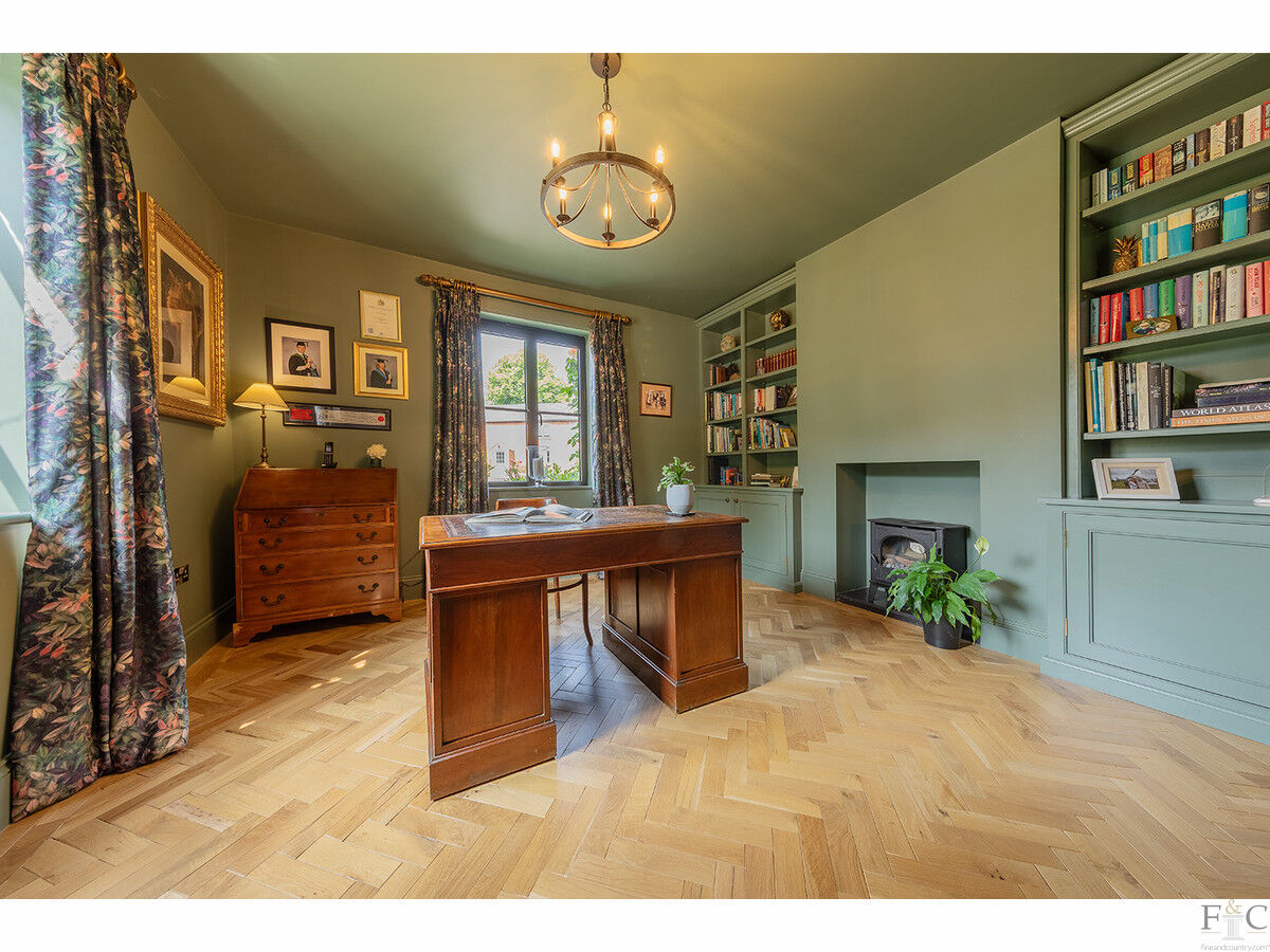 To the front, a dual-aspect reception room with parquet flooring and custom cabinetry currently serves as a home office, but would equally suit use as a snug or playroom. Across the hall, a well-appointed boot room and adjoining shower room offer flexible functionality combined with independent access, this wing of the house could work beautifully as a ground floor bedroom suite, treatment room or private consulting space.