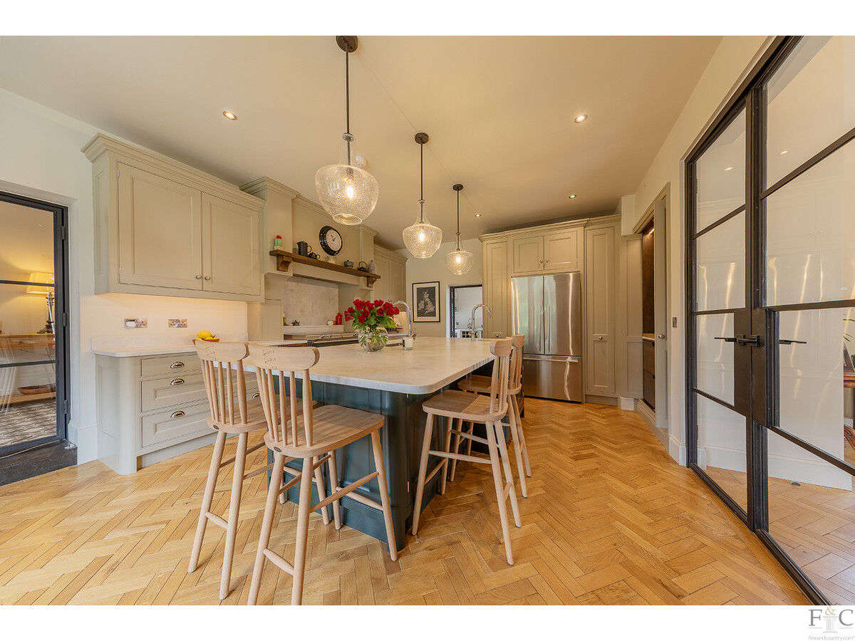The heart of the home is the striking open-plan kitchen, separated by Crittall-style glazed doors and fitted with bespoke Fraser James cabinetry, honed quartz worktops, and a generous central island. The kitchen includes a discreet butler’s pantry, Everhot range, and high-spec appliances, with a charming window seat offering views to the garden. A spacious utility room sits adjacent, seamlessly balancing practicality and style.