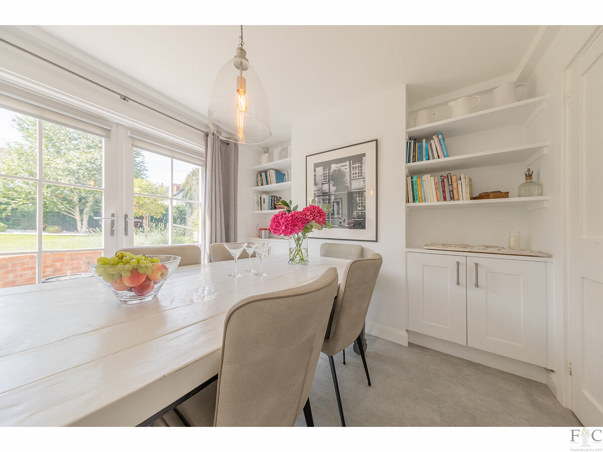 The kitchen diner is the true heart of this home — crafted with sleek quartz worktops, premium Siemens appliances, and bespoke cabinetry that combines practicality with beauty. A secondary dining area, complete with bespoke shelving, provides a relaxed setting for casual meals, morning coffee, or quiet reading, with views across the garden. A practical utility room and cloakroom complete the ground floor, ensuring everyday life runs with ease.