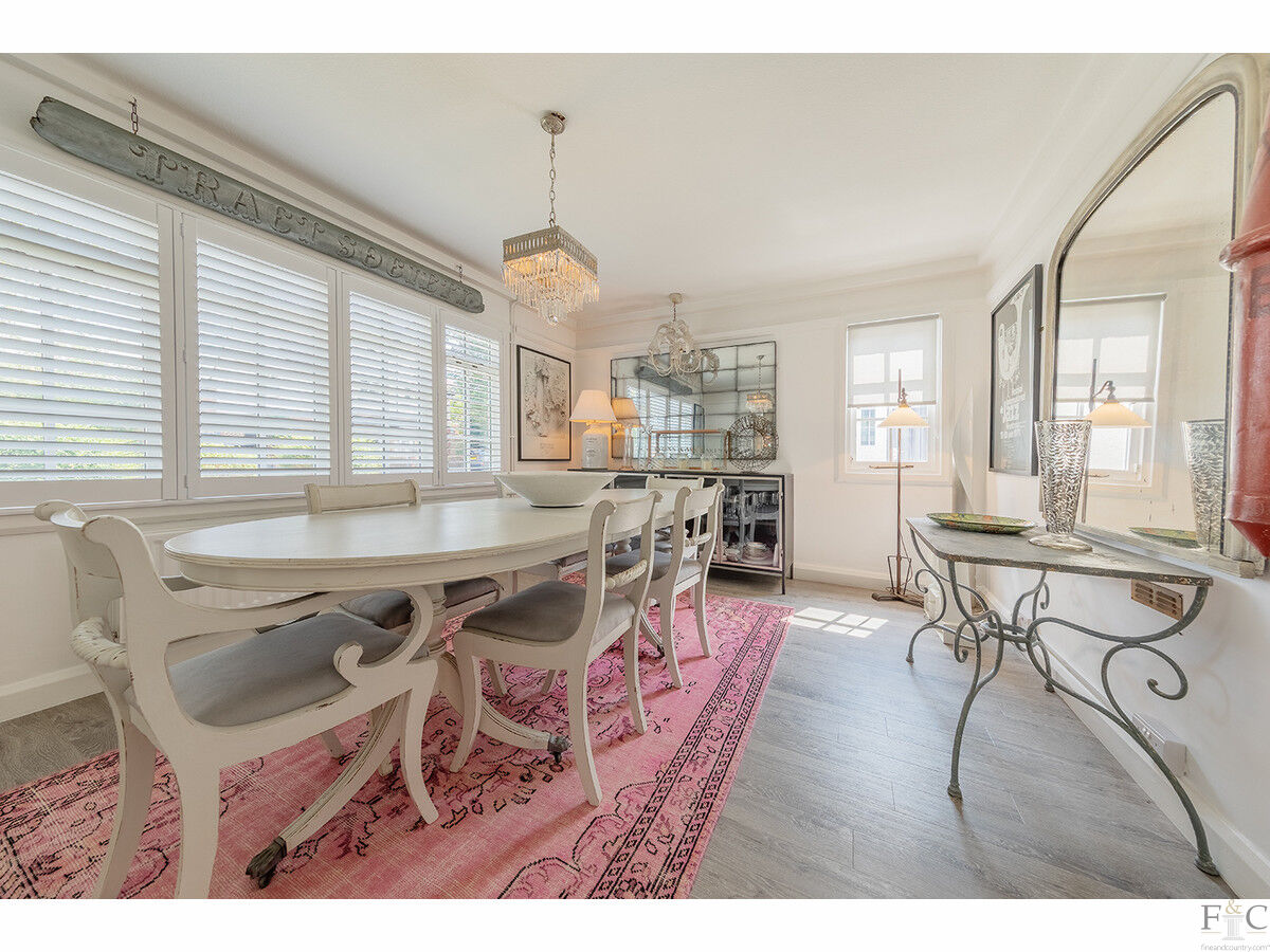 The formal dining room to the front is currently arranged for entertaining, yet its proportions and privacy make it equally suited as a sophisticated study, library, or even an additional bedroom for guests. The lounge, equally inviting, centres around a feature gas wood-burning stove — the perfect spot for winter evenings — and flows effortlessly onto the rear patio through French doors, inviting the garden into your living space.