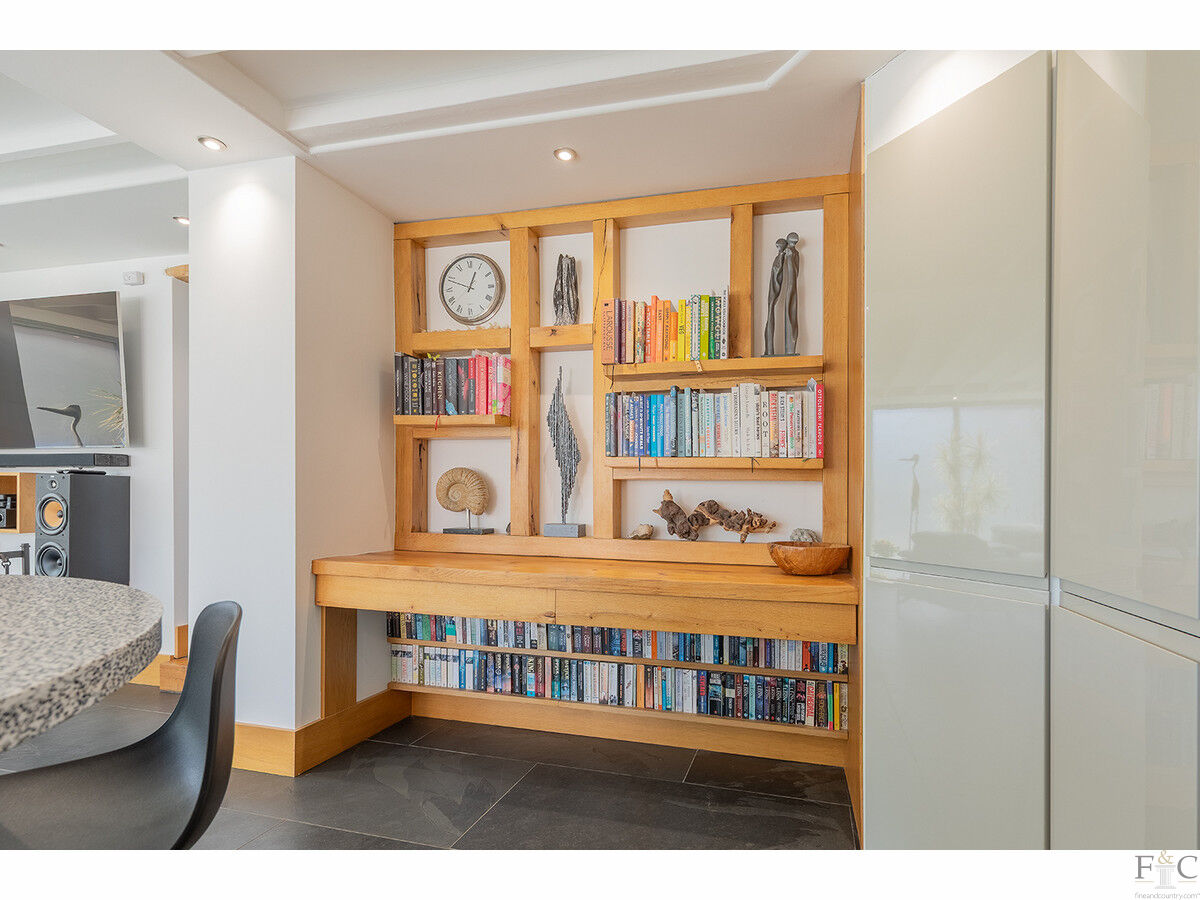The central island houses an induction hob, a sink with boiling water tap and waste bin cupboard. A curved Corian worktop provides seating for eight people and a full height wall of cupboards includes a small pantry area. Further worktops permit food preparation and spaces for equipment while integrated appliances such as a fridge freezer and eye level electric oven and steam oven are also included. A wine rack, two large larder cupboards, a double door cupboard for coats and a feature bookcase made from French oak includes two large cutlery drawers and completes the designer kitchen.
