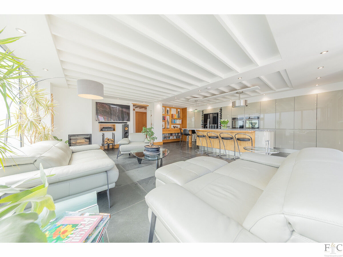 Stepping down into the kitchen from the hall, the impressive open plan living space is organised into purposeful zones. The kitchen has an individually designed island for informal dining and a very large lounge area, presently arranged to benefit from a media wall and a wall corner log burner. Floor to ceiling translucent panes of glass along two elevations begin here – the master bedroom suite is immediately above – and full height bifolding doors that open onto a secluded patio area.