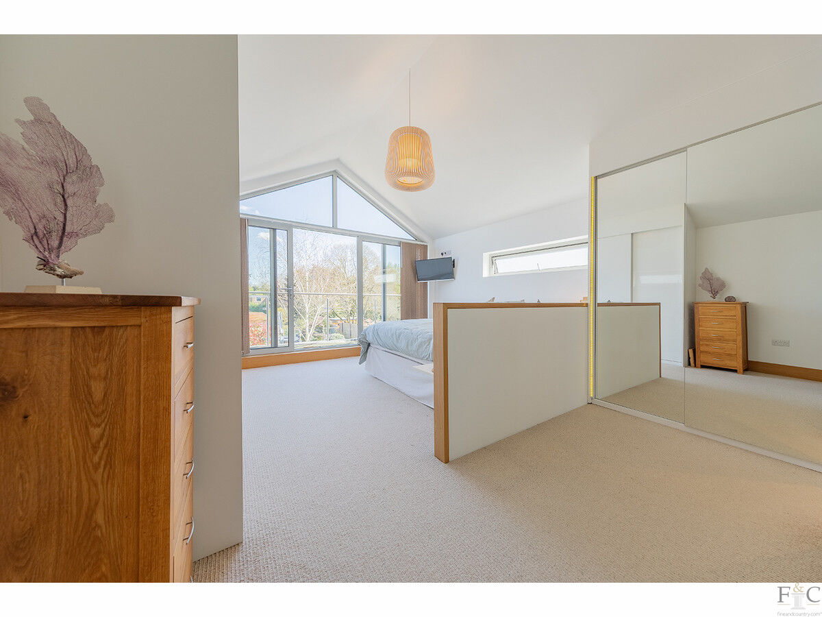 There are four double, carpeted bedrooms on the first floor. The master suite to the rear, has patio doors opening onto a balcony. This permits views over the sedum roof of the garage/gym and garden beyond. It is a particularly luxurious room and has a vaulted ceiling, a fully glazed gable end and a pair of integrated wardrobes. Its large ensuite has spiralled glass partitioning, a walk in shower, toilet and vanity unit.