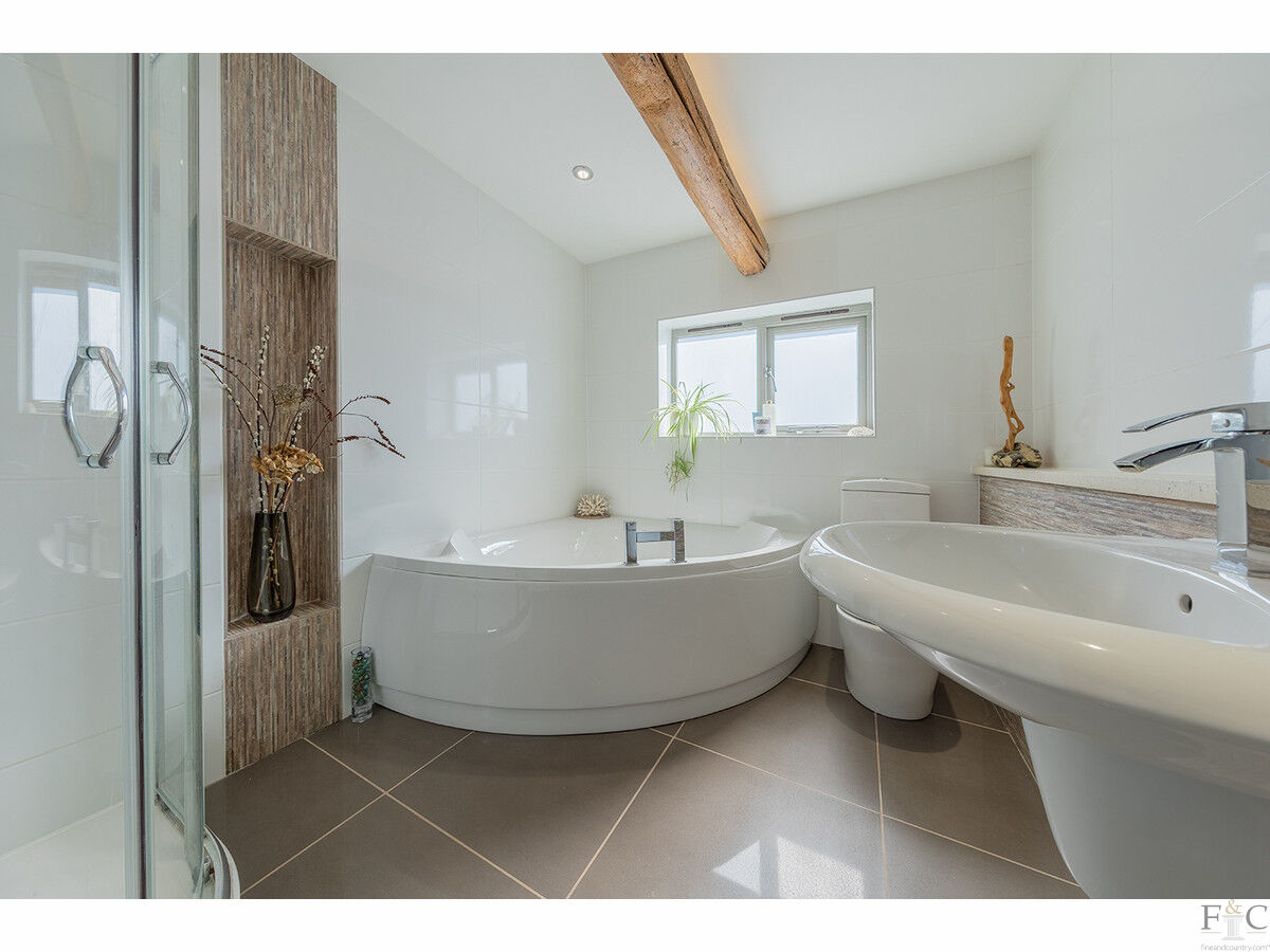 The substantial family bathroom is equipped with a large quadrant shower and corner bath, vanity unit and toilet. As with many aspects of this property, the bathing facilities have been totally renewed, redecorated and accessorised to a high specification providing beautifully designed rooms with white suites, contemporary lighting and pristine tiling.