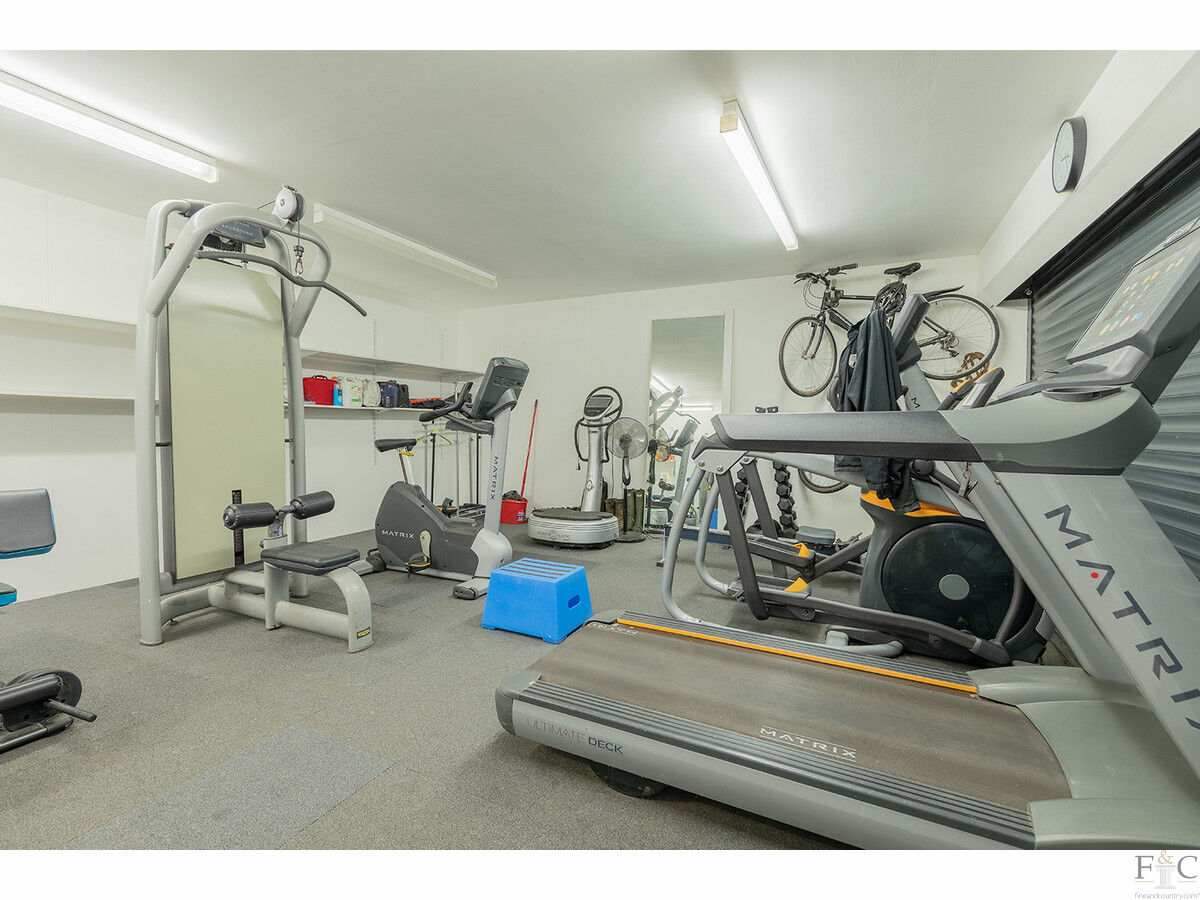 To the side of the patio outside of the living room, the corridor presents as a wall of glazed glass and hides the rooms within but means that the facilities are within easy reach. This corridor leads to the double garage which is currently used as a gym. It has an alcove suitable for a fridge and freezer, and hooks for coats. Electrically operated garage doors allow its original use to be recommissioned but a single steel side door equally permits other options.