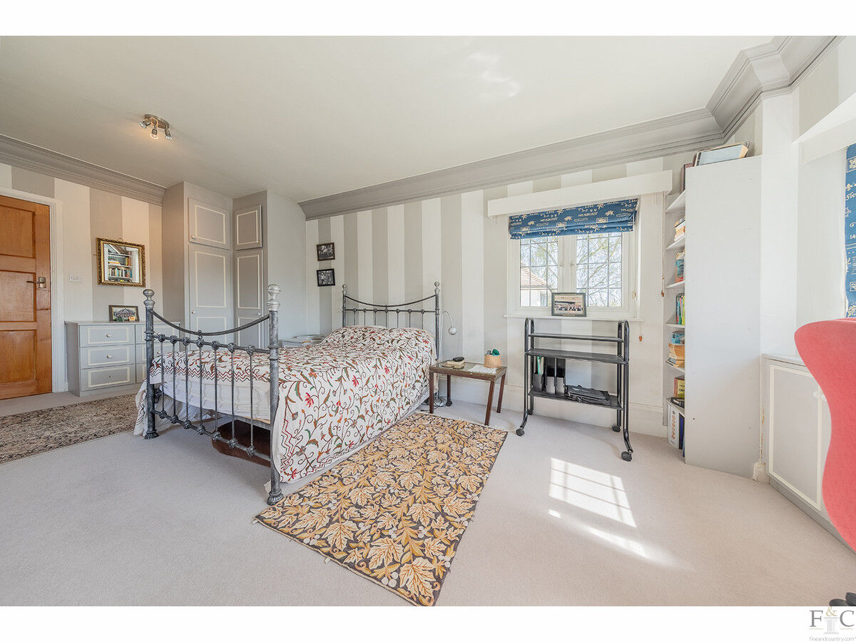Ascending the return staircase, framed by an original cast-iron balustrade, you’ll reach a broad and open landing — a tranquil reading nook leading to four generously proportioned bedrooms.