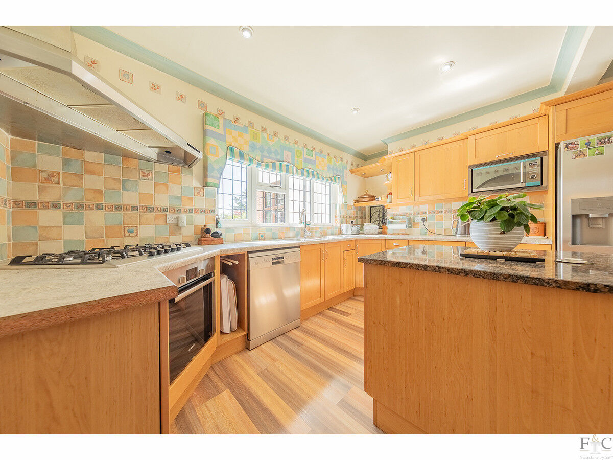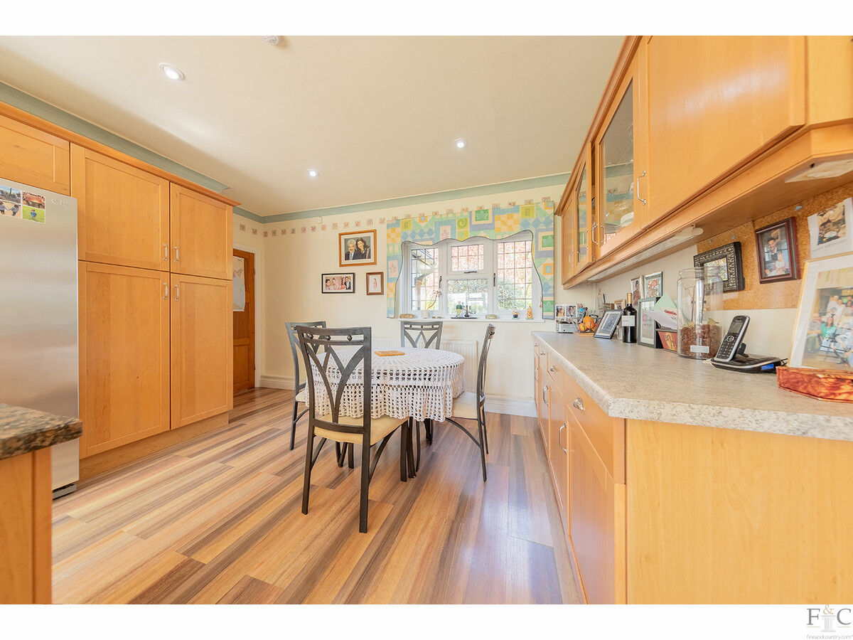At the heart of the home lies the kitchen and breakfast room — a warm, functional space with fitted cabinetry, a central island, and a charming outlook to both the driveway and rear garden. Tiled with character and filled with light, it blends style and practicality in equal measure.