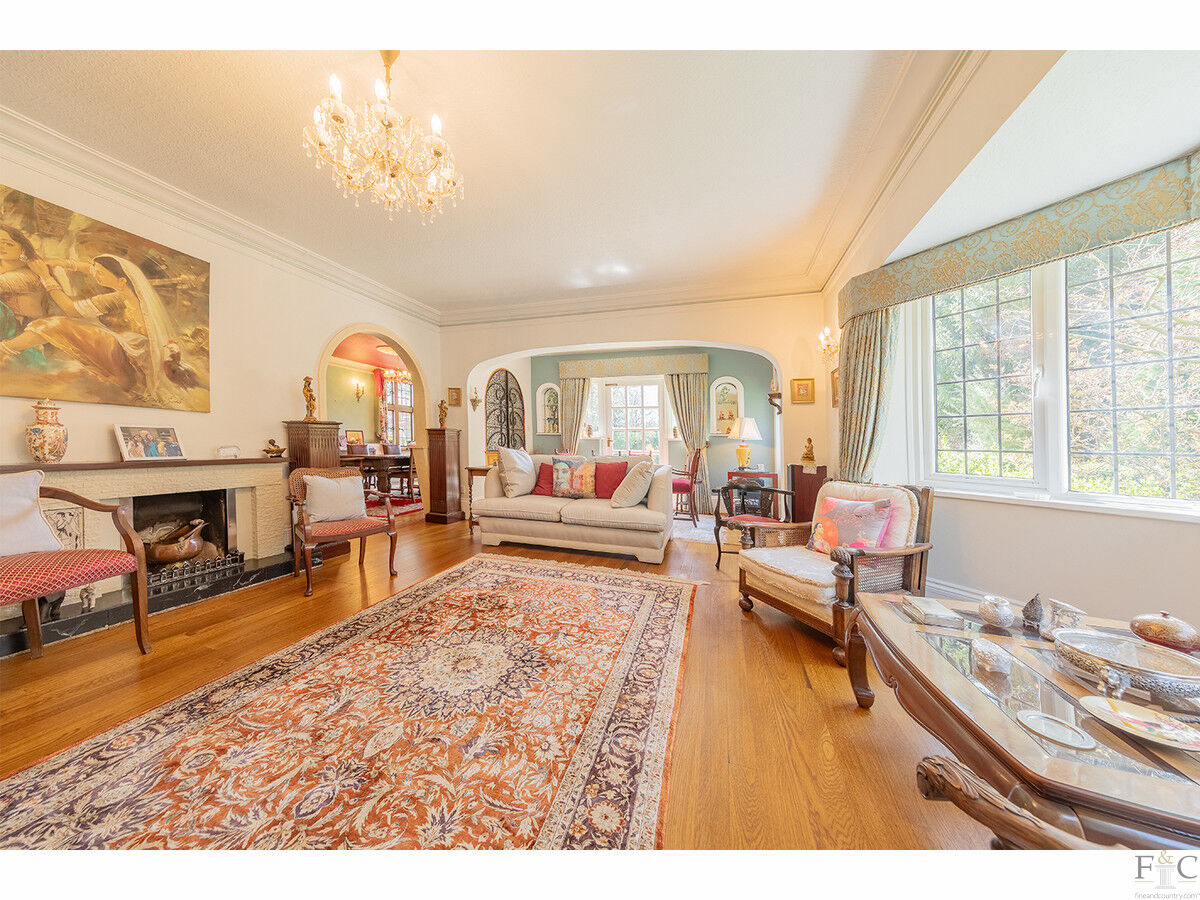 Flowing seamlessly through a graceful archway is the regal dining room, rich with character and designed for memorable dinners. A grand window frames garden views like a painting, while the room's generous dimensions allow for large-scale entertaining with ease.
